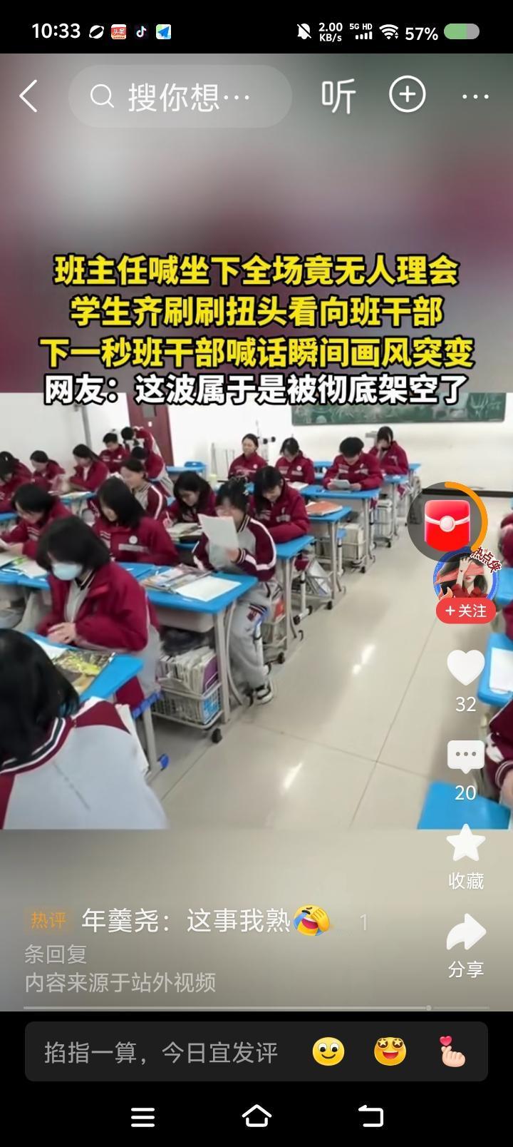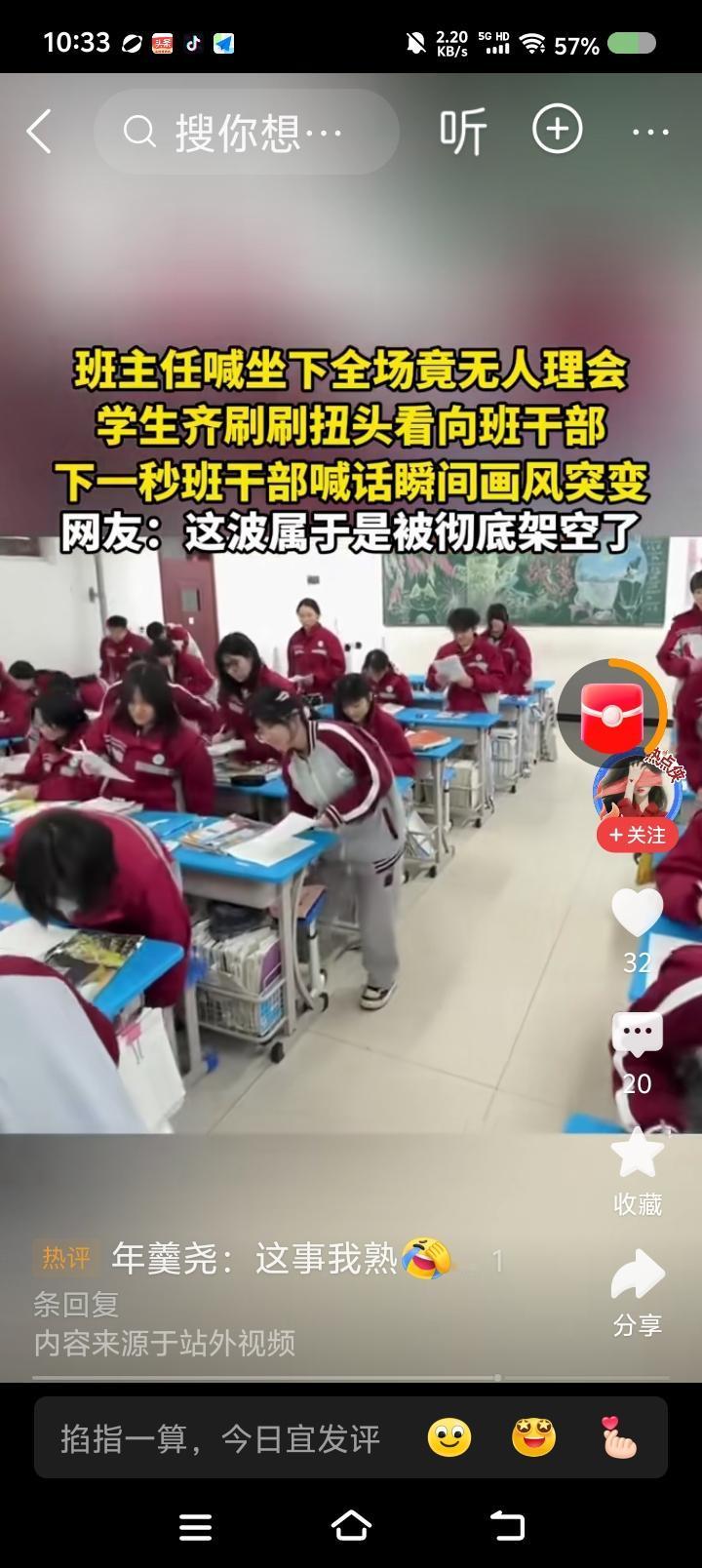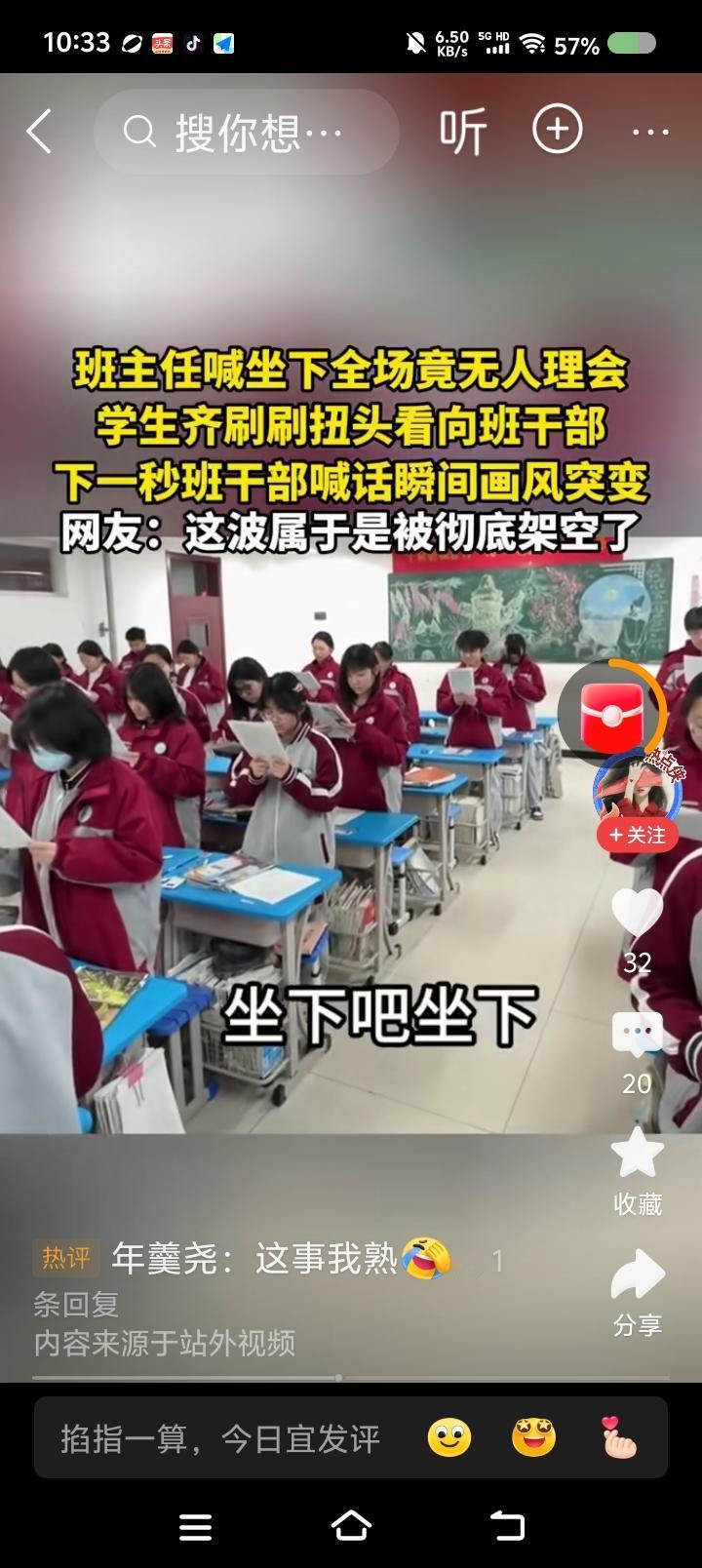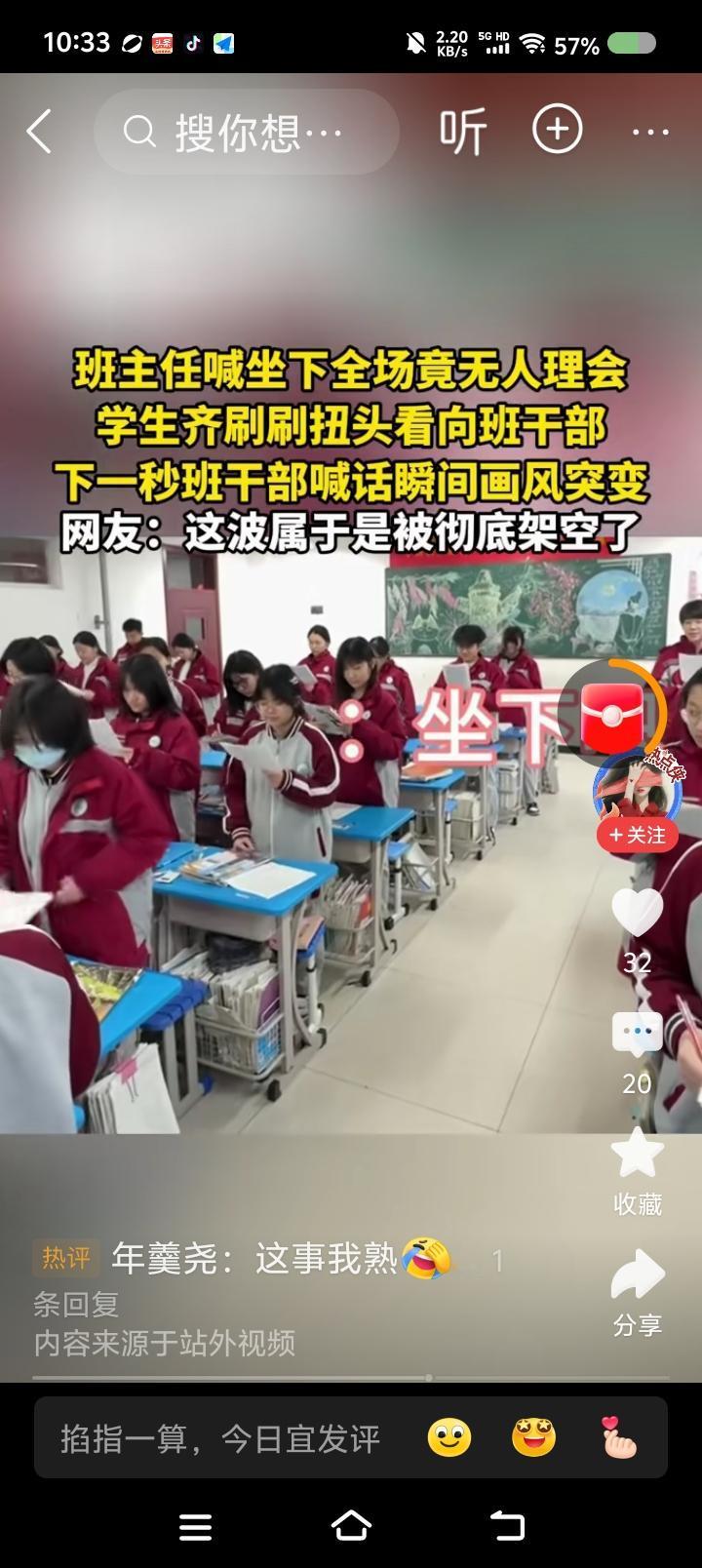 班长架空了班主任?—— 网上视频:某班学生都站着看书,班主任让坐下,无人理会,看向班长。班主任再次让坐下,班长发话了,学生才落座。 点评: 是否在处罚?看着气氛不对。