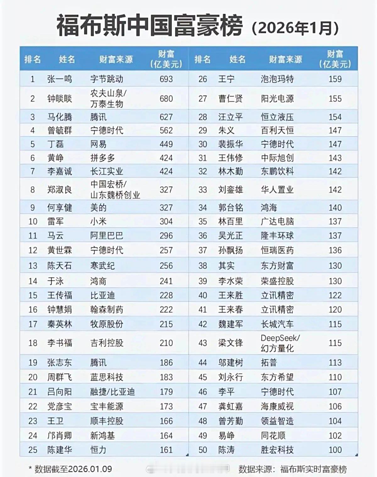 福布斯中国富豪榜 富豪排行榜向来是行业发展的重要风向标。十几年前,房地产商曾长期霸榜;如今,互联网、智能制造等新质生产力领域的企业家已成为榜单主力。这一变化也折射出,当下的高利润热门行业,与普通大众的参与门槛日渐拉大。互联网张一鸣或成为中国第一个世界首富马化腾钟睒睒