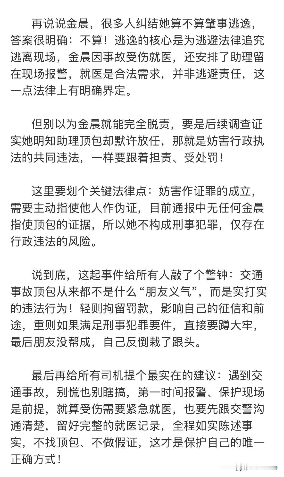 2月1日,看到周兆成律师解读金晨一事,了解了金晨及其顶包助理后续将面临的处罚,同时大家讨论的争议点也有了明确答案 事情并没有大家想的那么复杂,同时也没有大家想的那么简单,总而言之就是金晨及其顶包小助理都有做错的地方,所以都要接受相对于的处罚,处罚虽然不算重,但拘留对金晨艺人演员职业来说,影响还是很大的 首先口碑受损有了不良记录,其次有关车的商务后面基本跟金晨无缘了,最后金晨的待播剧,待拍剧及待录制的综艺如今播出,开机,录制都是一个未知数! 不仅针对艺人,希望所有人引以为戒!