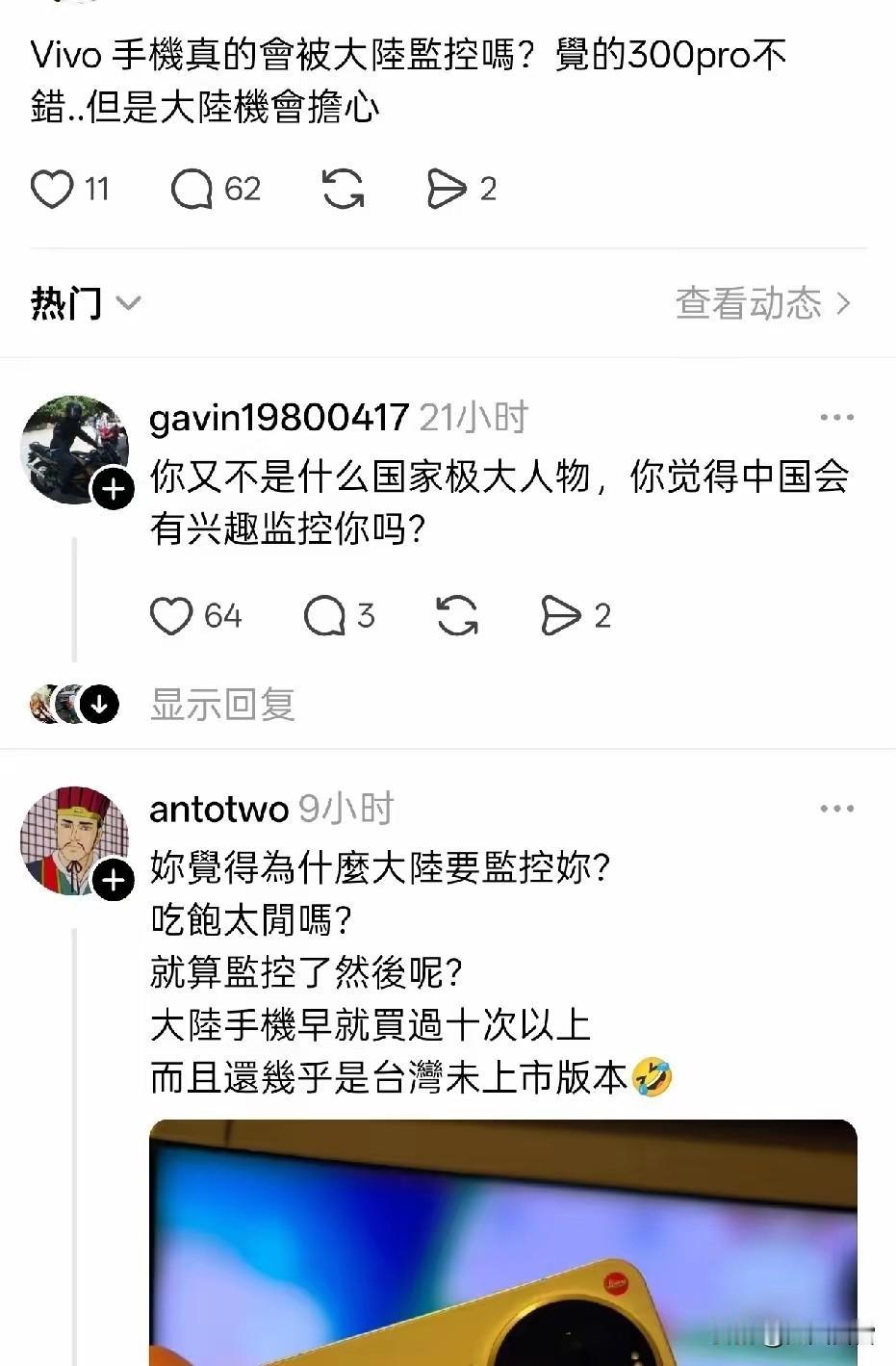 为什么对岸很多人认为使用大陆品牌的手机会被监控? 其实都是绿营的假宣传,搞得人心惶惶。 你一个普通人,会有国家机构花大力气去监控你吗?监控你有什么作用?是不是吃饱了太闲没事做? 还不如担心美国品牌手机去监控你吧?毕竟欧洲很多领导人使用美国品牌手机被监控! 台岛淡论 手机