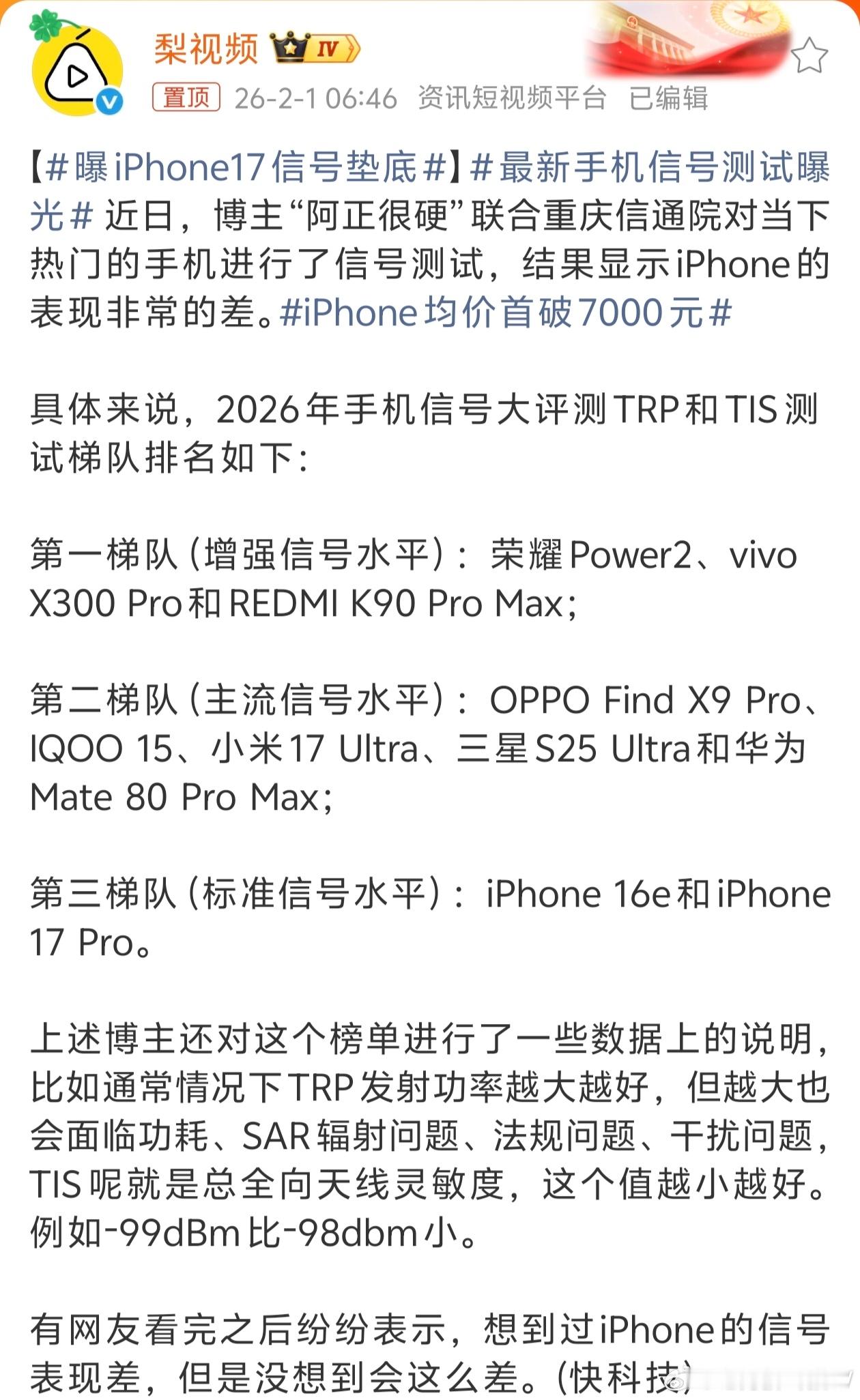 曝iPhone17信号垫底虽然说iPhone信号不好一直都是痛点,但是真的没想到