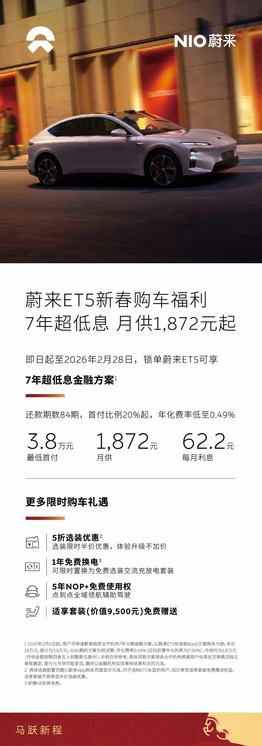 蔚来这个2月限时购车方案力度真挺大啊。7年84期,年费率低至0.49%,算下来月供压力小很多。BaaS方案首付3.8万起,电池寿命也不用焦虑了。这次还标配100度电池,加上各种选装和NOP+权益,整体算挺有诚意,还在观望,又想新年开新车的朋友,可以下手了!