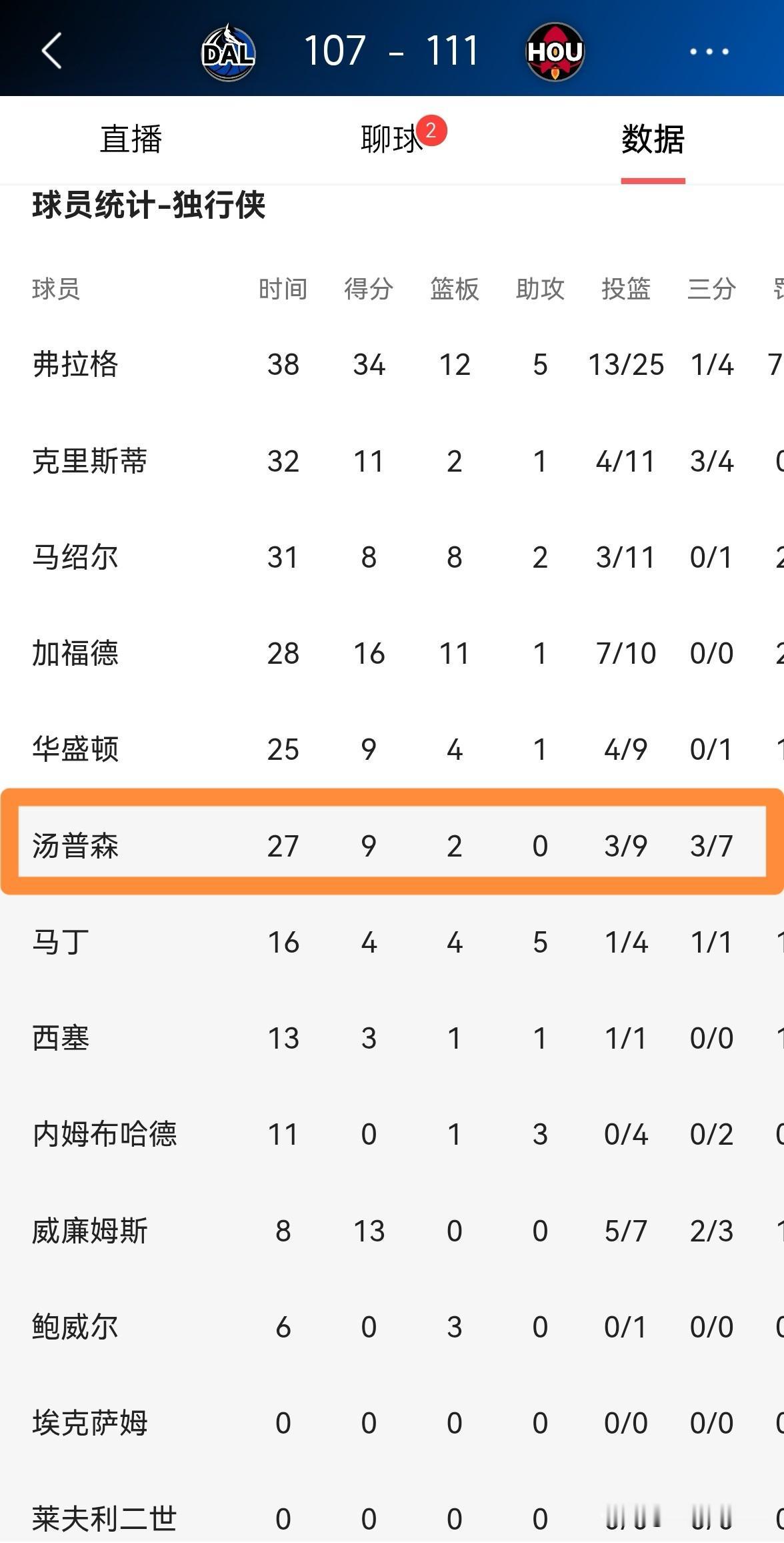 独行侠老将汤普森真是毫无战术地位!在今天独行侠客场以107:111不敌火箭的比赛中,汤普森替补出战27分钟,投篮9中3,其中三分球7中3得到9分2篮板,他的场上正负值为+7。 实事求是的说,如果独行侠主帅基德能够为汤普森设计更多的接球投篮的战术,我相信汤普森一定能够在三分线外为球队提供充足的火力。只要汤普森能够获得轻松的接球投篮的机会,他的三分球命中率还是非常可观的,可惜的是汤普森在比赛中几乎没有这样的战术待遇。