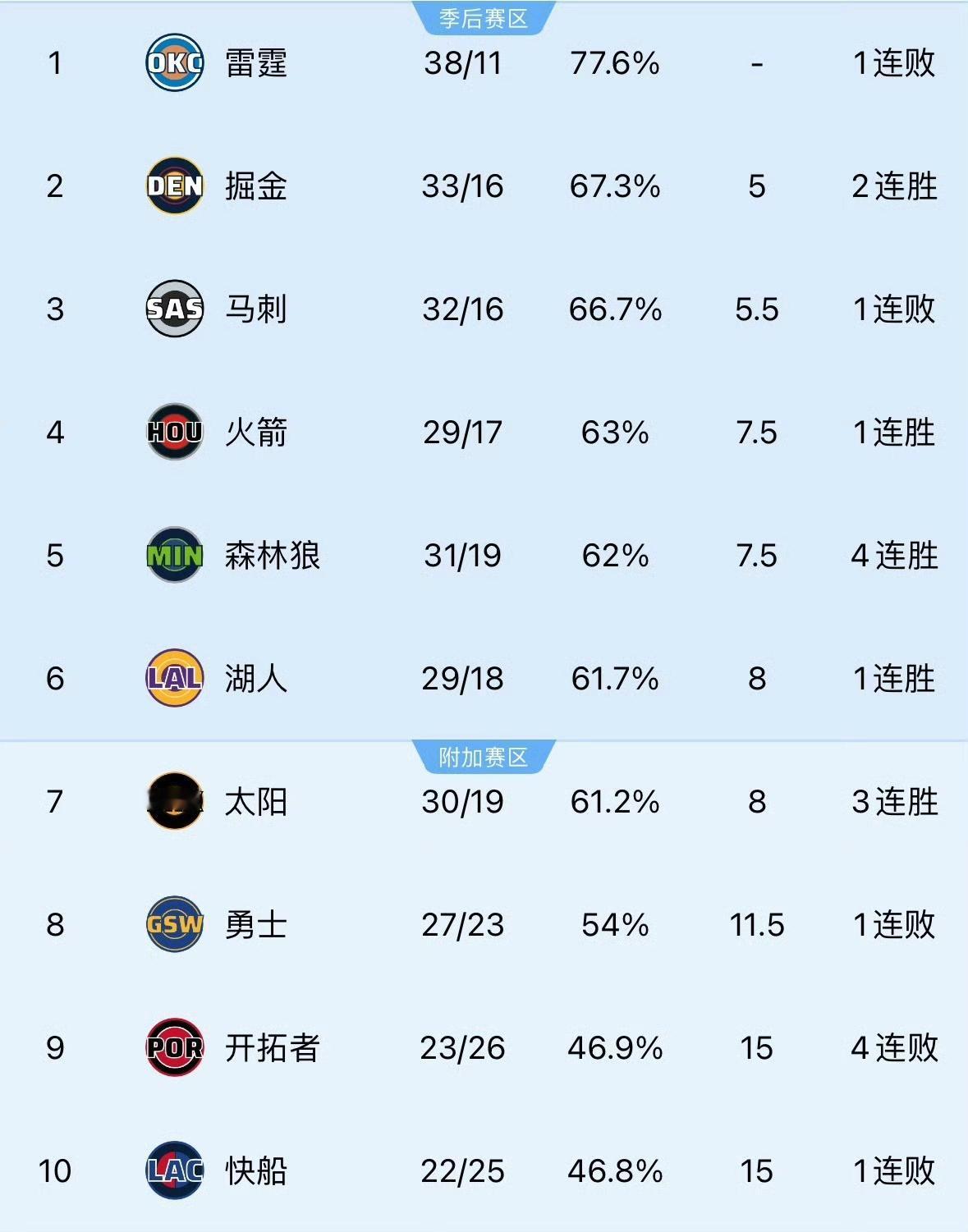 亨特去了国王,小黑又一次换队,湖人又一次落空!西部前六排名再次大挪移。 马刺爆冷输给黄蜂,排名被掘金反超,约基奇复出,掘金战绩稳步上升。 森林狼大胜灰熊,排名反超湖人,湖人距离附加赛区胜场差一样,随时掉入。 火箭险胜独行侠稳居第四,独行侠距离附加赛渐行渐远。