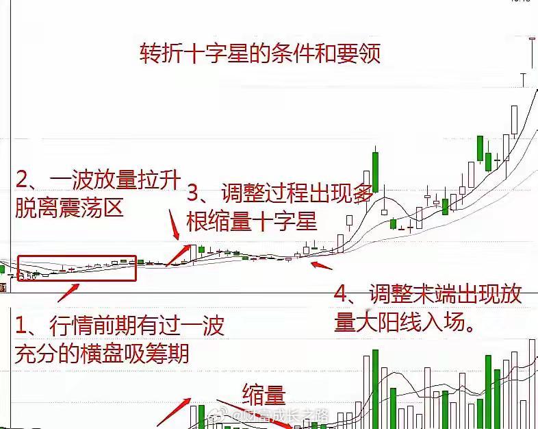 1. 核心前提:经历标志性的突破性上涨 行情必须首先经历至少一波强劲的、以涨停或大阳线为标志的拉升,有效脱离前期的底部盘整平台或重要压力位。这波上涨需要伴随成交量的显著放大,这是主力资金正式发动行情的“发令枪”,也为后续的洗盘提供了明确的空间参照。2. 形态关键:出现位置特定的“分歧十字星” 在突破性上涨之后,股价进入短暂休整。此时,K线图上应出现实体极小、上下影线明显的十字星(可以是标准十字、T字或倒T字)。这颗十字星的关键在于其位置:它必须出现在前期涨停板收盘价的上方或附近,表明股价拒绝深幅回调,强势特征未改。连续出现此类十字星,则是多空分歧加剧、即将再次选择方向的强烈暗示。3. 量能验证:调整过程必须呈现“缩量”特征 在收出十字星的调整过程中,成交量必须呈现有序的萎缩状态。这是判断是“洗盘”而非“出货”的生命线。缩量表明在当前的价位区间,抛压正在迅速减轻,前期跟风的不坚定筹码已被有效清洗,市场浮筹减少,为主力的再次发力扫清了障碍。4. 确认信号:出现“次日起爆”的转强K线 十字星形态本身只是预警,真正的进场确认信号出现在次日或随后的一两个交易日内。此时,需要出现一根坚决的阳线,其收盘价最好能超越十字星的最高点,形成“穿透”或“覆盖”之势。同时,成交量需再次温和放大,这表明新的买盘力量已经涌入,平衡被打破,方向选择向上,主升浪的二次起跳点正式确认。