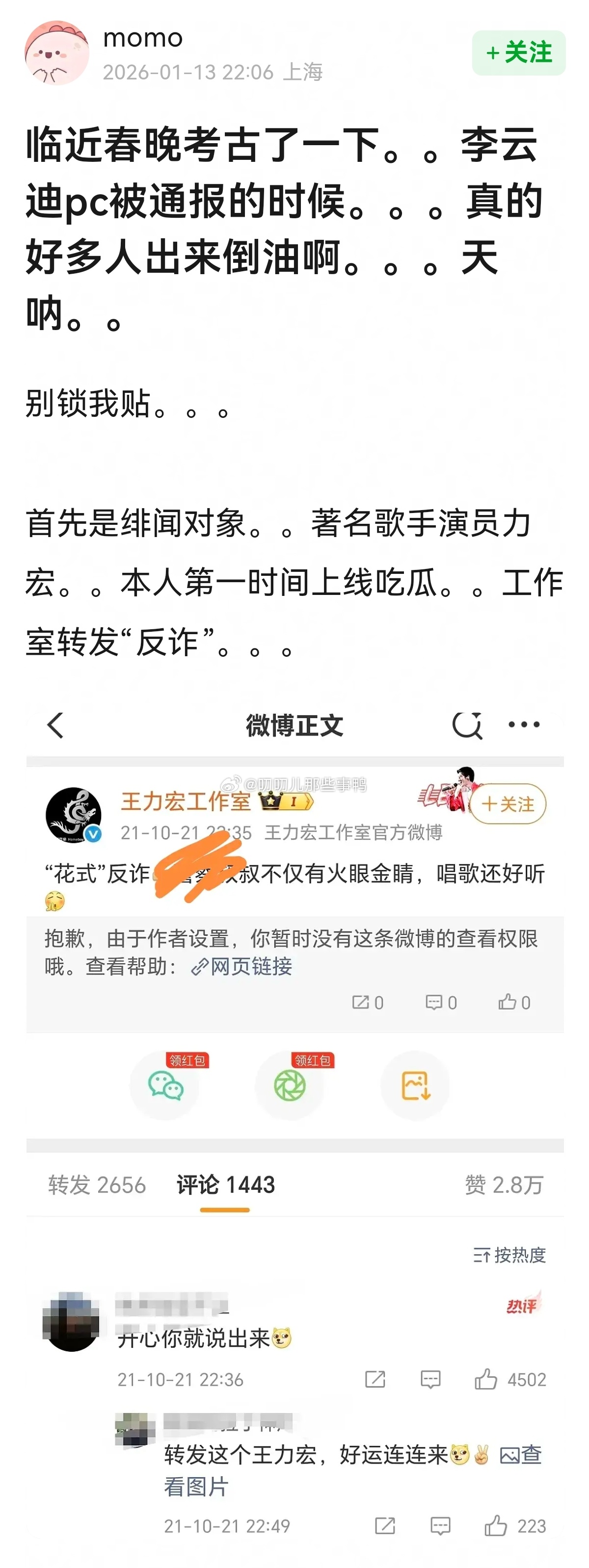 临近春晚考古了一下,李云迪pc被通报的时候,真的好多人出来倒油啊~