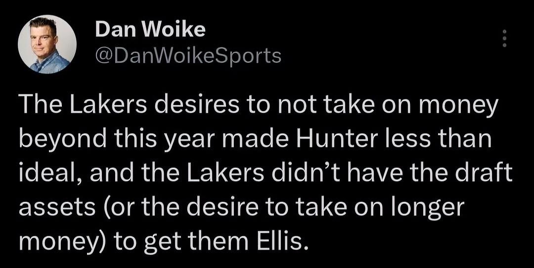 信号明确,湖人就是要重新组队! 亨特交易已达成,而交易方并不是之前爆出的湖人,国王送出了埃利斯+施罗德作为筹码,公牛则成为第三方获得两个次轮签! 根据湖人队记Dan Woike的最新报道,湖人之所以放弃亨特是因为不想接收非到期合同,而他们也不愿为埃利斯送出首轮签。从中我们可以得出两点结论: 1.管理层信号十分明确,那就是与去年休赛期制定的目标保持一致,释放所有到期合同,并保留交易资产进行半重建。 2.对本赛季没有寄予成绩上的追求,这期间传出的交易对象还是以到期合同为主。 在无重大变动的情况下,本赛季结束后湖人还有合同在身的球员仅东契奇、范德比尔特和拉拉维亚三人,手握球员选项的艾顿和斯玛特不管是否执行合同他们都已经是东契奇招募而来的合作对象。球队休赛期总释放薪资在接近5000万到5000多万不等,具体主要取决于包括小里在内的几名球员选项和球队选项的操作。 从当下交易市场来看,几乎不可能有超巨试水自由市场,即便要走也是通过签换,因此湖人这一策略裸签第二球星的可能性不大,主要还是为了更换适配东契奇的角色成员围绕其重建,后续有机会的情况下打包首轮签完成第二球星的引进。 最后关于老詹的去留,目前来看并不乐观,首先就是大幅降薪,其次个人是否继续打球的意愿,第三湖人能否组成真正意义有竞争力的球队,我还是坚持观点老詹不会加盟其他球队,但鉴于目前的情况加上与球队矛盾,不得不承认这可能会加速他退役的决定!