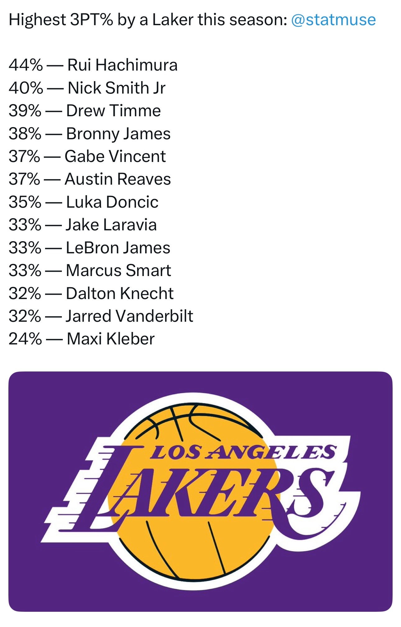 湖人球员本赛季至今三分命中率榜单,东契奇、拉拉维亚、斯玛特再提升3%到4%就更好