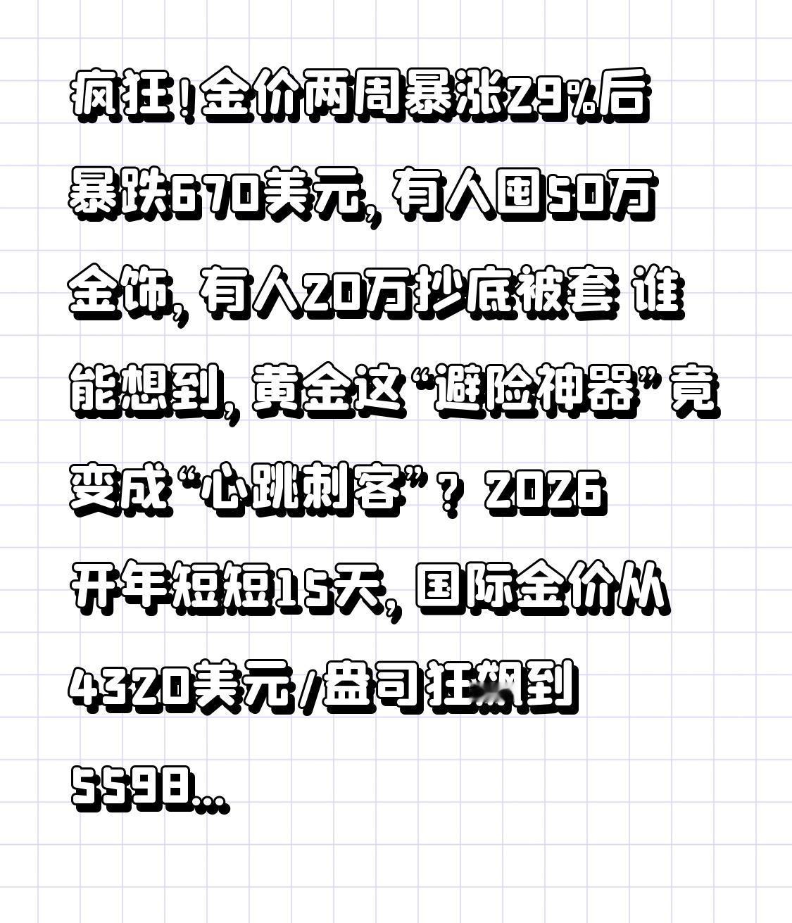 疯狂!金价两周暴涨29%后暴跌670美元,有人囤50万金饰,有人20万抄底被套 谁能想到,黄金这“避险神器”竟变成“心跳刺客”?2026开年短短15天,国际金价从4320美元/盎司狂飙到5598美元,涨幅直逼29%,杭州、深圳等地市民连夜排队抢金,有人豪掷50万扫货,可短短30小时后,金价突然跳水670美元,创下40年来最大单日跌幅,一批抄底者瞬间被套,这场过山车行情到底谁在操控? 这波金价疯涨早有苗头。全球央行、稳定币巨头都在疯狂囤金:波兰央行一年扫货100吨,连续两年成最大央行买家;Tether囤金140吨,藏在瑞士前核掩体里;全球最大黄金ETF持仓超1090吨,三大买家合计持仓近1780吨。市场恐慌情绪叠加春节消费旺季,普通市民也跟着跟风——胖东来黄金柜台被抢空,无预约要排3小时队;杭州老铺黄金有人搭帐篷彻夜排队,黄牛炒号卖到500元一个,二手回收商刚买完就加价抛售,黄金俨然成了“闭眼赚”的香饽饽。 可狂欢背后,转折点来得猝不及防!1月30日特朗普提名“鹰派”美联储主席沃什,市场瞬间慌了神。这位曾坚决抗通胀的大佬,虽近期改口支持降息,但投资者根本摸不透他的真实立场,美元指数单日暴涨1.01%,引发程序化抛售,380亿美元黄金被疯狂甩卖,30小时内金价暴跌12%,直接从5598美元砸到4682美元。最惨的是李先生这样的散户,花20万抄底200克黄金,本想坐等升值,结果刚买入就被套,现在想变现都难——首饰金买价1500元/克,回收价却只有1080元/克,一买一卖就亏近8万。 更坑的是普通人不知道的投资陷阱!很多人跟风买品牌金饰当投资,却不知道加工费、品牌溢价占比极高,回收时这些成本全归零,相当于白扔钱。而且黄金变现门道多,小众品牌或特殊工艺金饰根本没人要,正规平台极端行情下还会暂停赎回,黑平台更是靠高杠杆诱导诈骗,不少人血本无归。专家早就提醒:黄金只适合长期配置,占资产10%-15%即可,想靠短期炒金暴富,纯属赌运气。 这场金价过山车,戳中了无数普通人的理财焦虑。我们都想在不确定的市场里找个“避风港”,却容易被暴涨行情冲昏头脑,盲目跟风最终被割韭菜。黄金的本质是避险,不是投机,与其追涨杀跌赌行情,不如理性规划资产。 你在这波金价波动中是赚了还是亏了?你觉得金价还会反弹吗?评论区聊聊你的看法,转发给身边想抄底的朋友,别让贪心变成亏损!