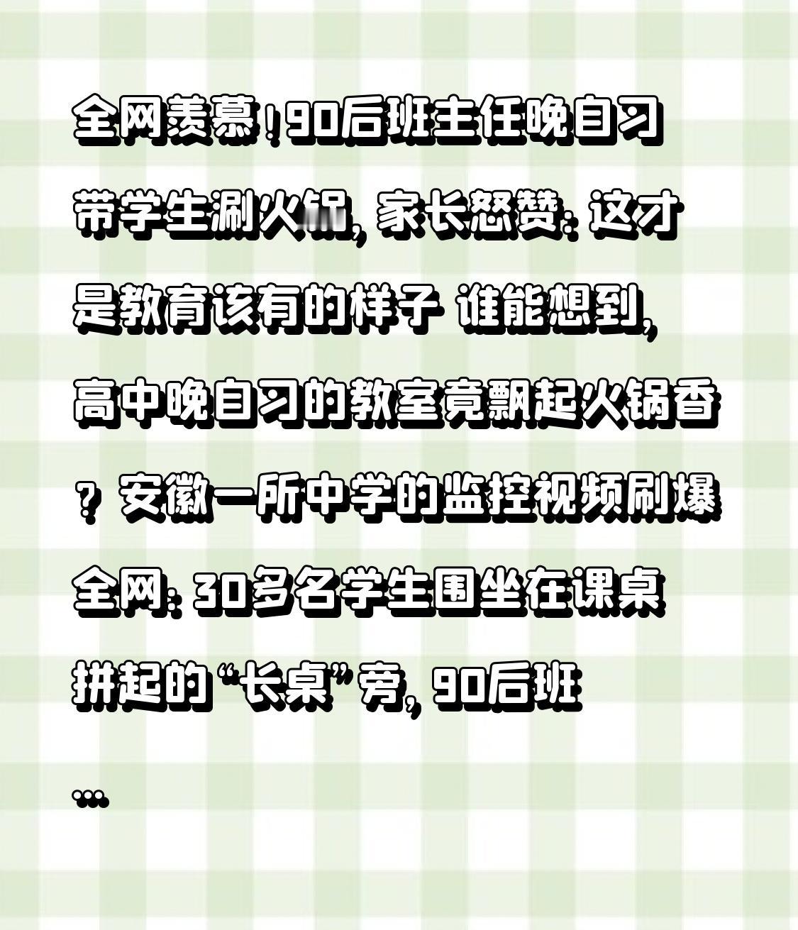 全网羡慕!90后班主任晚自习带学生涮火锅,家长怒赞:这才是教育该有的样子 谁能想到,高中晚自习的教室竟飘起火锅香?安徽一所中学的监控视频刷爆全网:30多名学生围坐在课桌拼起的“长桌”旁,90后班主任小李戴着围裙忙前忙后,鸳鸯锅底冒着热气,肥牛卷、虾滑、青菜摆满桌面,学生们边涮边笑,连隔壁班老师都忍不住来蹭饭,这一幕让无数网友直呼“神仙班主任”! 视频走红后,评论区却出现了不一样的声音——有人质疑“晚自习不学习搞聚餐,太不务正业”,还有人担心“火锅味难散影响后续上课,存在安全隐患”。面对争议,班主任的回应揭开了暖心转折点:原来这是他和学生的“约定兑现”!月考前夕,班级整体成绩下滑,学生压力大到失眠,小李就承诺“只要月考进步10名,就满足大家一个愿望”。没想到孩子们齐心协力,真的从年级23名冲到12名,而他们的愿望不是放假也不是礼物,竟是“和老师一起吃顿火锅”。 更让人动容的是,这场火锅宴藏着满满的细节:小李提前和学校报备,用的是电煮锅而非明火,食材都是自己早上6点去菜市场挑选的新鲜品类,还特意准备了不辣的清汤锅照顾肠胃敏感的学生;为了不耽误学习,他们约定“吃40分钟就回归自习”,学生们吃完后主动收拾桌椅,教室很快恢复整洁,甚至学习效率比平时更高。有学生偷偷录下视频,配文“这是高中三年最难忘的一晚,感觉老师不是长辈,更像一起并肩的朋友”。 其实小李的教育方式一直很“出圈”:他会在班会课带学生玩“你画我猜”缓解压力,会把知识点编成顺口溜方便记忆,会在学生生日时送上手写贺卡,甚至允许学生在课堂上提出不同观点。有家长一开始不理解,觉得“太纵容孩子”,可看到孩子越来越开朗、成绩稳步提升,也渐渐改观:“以前孩子怕老师,现在放学就念叨李老师,连叛逆期都变得懂事了”。 这场晚自习火锅宴,之所以让人热泪盈眶,是因为它打破了“老师严肃、学生听话”的刻板印象。好的教育从来不是单向的灌输,而是双向的温暖与陪伴。90后班主任用年轻人的共情力,读懂了学生的压力与渴望,用一顿火锅让教育有了温度。就像网友说的:“多年后学生可能会忘记公式定理,但一定记得那个晚自习,和老师同学围坐在一起的火锅香”。 你上学时遇到过这样的神仙老师吗?评论区聊聊你的校园回忆,转发给身边的老师和学生,让教育的温暖一直传递!