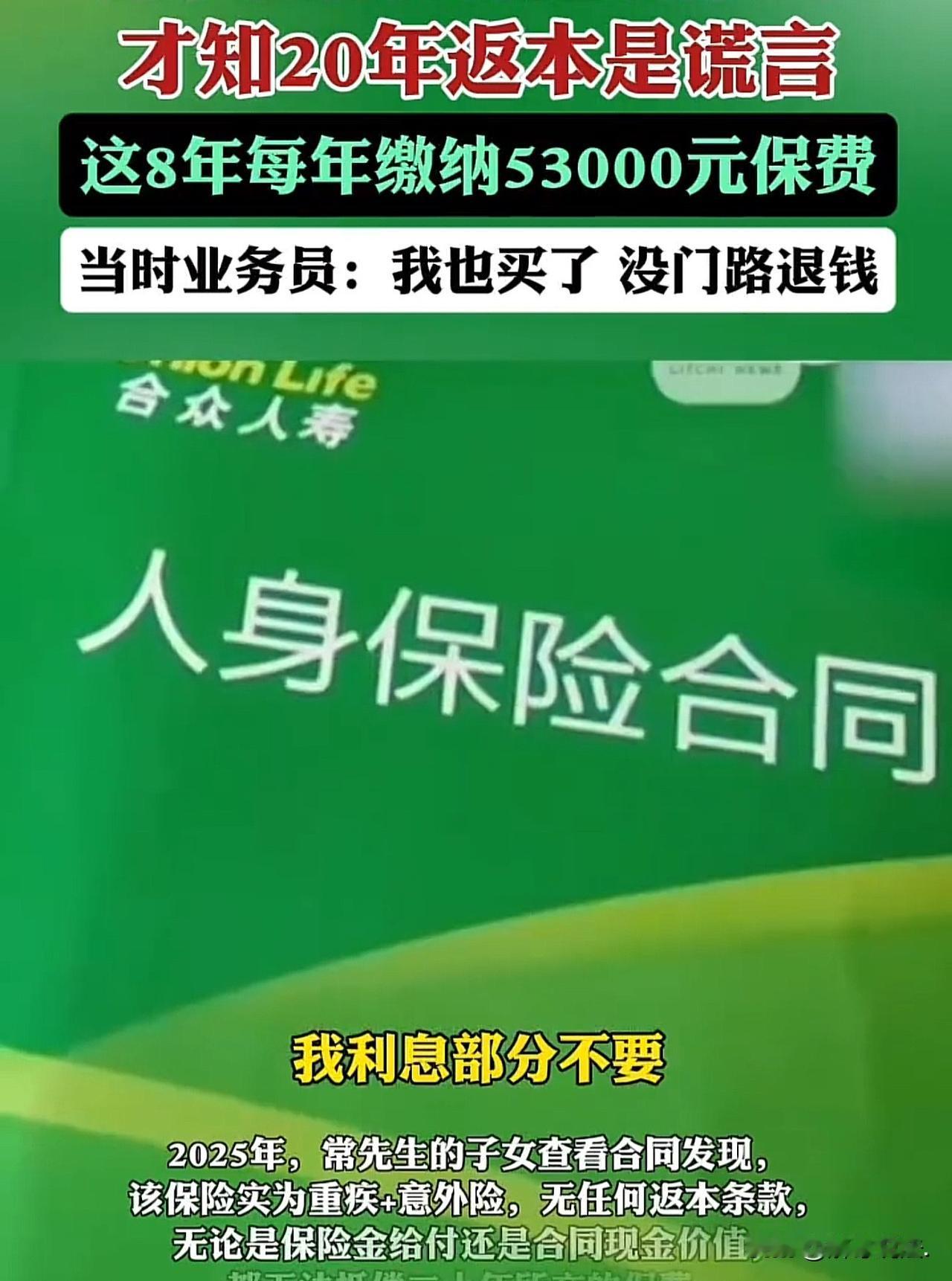 “能坑你的人,往往是你最亲近的人!江苏盐城,50岁男子经好朋友介绍买了份保险,每年缴53000元保费,20年后返还本100万,剩下的部分利息不用拿了,享受医疗保险。谁知,男子交了8年后,其儿女才发现被坑了,无任何返本条款,活着的时候根本拿不到本金,男子傻眼了:原来这钱自己有生之年一分也花不着呀!于是,男子赶紧找朋友去讨要说法,朋友的一番话把他气炸了! 2017年,50的常先生,感觉自己干点啥都力不从心了身子骨明显不如以前硬朗了,以前上楼,大气不喘,如今上个楼,都要歇个脚,不免感叹,不服老不行了! 常先生是个心里有算计的人,这些年打拼也存下一部分积蓄,用来养老用,小病小灾无后顾之忧! 但不怕一万就怕万一,万一一场大病下来,恐怕那点积蓄杯水车薪了。 常先生思来想去,认为买份保险抗风险,这样总不会花光积蓄治病,还不会拖累儿女。 再说自己还能走能撂,干点啥,都能把这份保险钱交上,即变相存钱了,又有了保障。 说来也巧,常先生的好朋友徐某就在保险公司上班。 他琢磨着,肥水不流外人田,再说好朋友总不能坑自己,就把想法跟徐某说了。 徐某一听,乐开了花,正愁业绩不达标呢! 打铁需趁热,徐某不敢耽搁,客户的想法随时都会变,赶紧把自己的师傅龚某请出山,带着师傅找上门去。 师傅从事保险行业多见,见人说人话见鬼说鬼话,什么样的客户都能应付得了。 一见面就口若悬河,各种险种介绍个遍,但主推一款险种,其险种每年交53000,交够20年,等常先生70岁的时候,能拿100万。 常先生也不是那种听风就是雨的人,这一交就29年,也不是一笔小数目,他细算了一下,20年下来本金刚好能回来,医疗保障还能享受到,虽然有几分动心了,但表示再考虑一下。 接着,龚某和徐某又一唱一和,说什么早买早有保障之类的话。 常先生出于对朋友的信任,便不再犹豫,当即决定签合同。 可当合同拿到手的时候,上面密密麻麻的条款常先生喵了几眼,一个头两个大,根本看不懂。 于是,他让徐某和龚某给自己讲讲。 可龚某说,跟他讲了也未必不懂,反正承诺的肯定算数,让他放一百个心。 常先生一想也是,没必要死抠字眼,朋友还能坑自己不成,就这么稀里糊涂签了字。 没想到到了2025年,投保都8年了,儿女们偶然看到这份合同,一看之下吓了一跳,说他肯定是被忽悠了。 原来这保险是重大疾病加意外伤害的,压根没写20年返还本金的事,不管是能拿到的保险金还是现金价值,连20年交的保费都抵不上。 男子傻眼了,合着这钱自己有生之年一分也花不着了,赶紧去找徐某。 可徐某说,他早就不在那公司干了,8年前他刚入职,对保险一窍不通,都是师傅龚某怎么说他就怎么传,他自己和媳妇当年也买了,现在想退都不知道咋弄。 这话说得常先生如遭雷击,8年下来,他已经交了40多万,那都是实打实的辛苦钱,难道就这么打了水漂? 他找去保险公司,对方说合同没问题。常先生急了:我没说合同有问题!是你们业务员宣传的和合同不一样! 没办法,常先生找了记者帮忙讨说法。 保险公司服务部回应说要往上反映,15个工作日给答复,可直到现在,也没半点消息。 《民法典》第148条规定:一方以欺诈手段,使对方在违背真实意思的情况下实施的民事法律行为,受欺诈方有权请求人民法院或者仲裁机构予以撤销。 龚某和徐某在销售保险时,故意作出“20年返100万本金”的虚假承诺,还隐瞒保险真实条款、拒绝向常先生明确说明合同内容,属于典型的欺诈手段,常先生正是因这份虚假承诺陷入错误认识,才签订了保险合同。 该民事法律行为符合可撤销情形,常先生有权向法院或仲裁机构申请撤销合同,要求保险公司返还已交保费并赔偿相应损失。 但常先生举证恐怕有点困难,当初全凭口头承诺掏的钱,既没留聊天记录、录音,也没让对方把“20年返100万”的说法写在纸上,口说无凭。 保险公司拿着白纸黑字的合同,常先生这边却拿不出对方欺诈的实锤,维权之路也注定艰难。 这也给所有人提了个醒:买保险、做投资,别只凭信任就稀里糊涂签合同,一定要仔细看完条款再签字。要知道,最容易坑你的,往往是身边亲近的人,千万别一味轻信,不然悔之晚矣。
