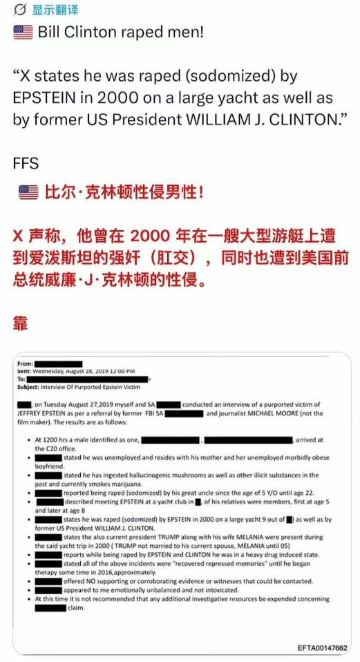 今天曝光的爱泼斯坦文件里说,20多年前,美国前总统克林顿(卸任后)性侵过一名男性,不得不说,美国有身份的人物玩得是真花啊…… 近期,尘封已久的爱泼斯坦相关文件被逐步曝光,其中一条内容格外引人注意。文件中提及,美国前总统克林顿在卸任之后,曾被指控性侵一名男性,这则传闻瞬间成为外界讨论的焦点。 要先把事情说清楚,爱泼斯坦是多年前震惊国际的美国富豪,因涉嫌性犯罪被调查,后来在狱中身亡,相关案件也随之被搁置。他生前交往甚广,不少美国政商名流都曾与他有过交集,克林顿也是其中之一。 而此次曝光的文件,并非官方正式通报,而是当年案件调查过程中留存的相关记录。文件中关于克林顿的这一指控,目前还没有得到明确的证实,也没有权威信息能直接推翻这一说法,处于真假难辨的状态。 说实话之所以这则传闻能引发关注,不光是因为涉及克林顿这样的前总统,更因为爱泼斯坦案件本身就充满争议。多年来,一直有消息称,爱泼斯坦的背后牵扯着美国上层社会的复杂关系,不少隐秘事件被刻意隐瞒。 要知道,此前爱泼斯坦文件曾多次被传出要曝光,却都不了了之。而这次文件得以部分公开,背后或许有多方力量的推动,也让外界看到了揭开这起陈年旧案面纱的可能。 不过,对于文件中提及的指控,目前还没有任何一方站出来明确回应。克林顿方面一直保持沉默,既不承认也不否认,这也让传闻的可信度又多了一层疑问。 其实,即便这则指控是真的,想要追究相关责任也并不容易。一方面,事件已经过去20多年,很多证据可能已经丢失,调查难度极大;另一方面,克林顿作为前总统,拥有强大的人脉和影响力,调查过程或许会受到诸多阻碍。 更值得注意的是,这则传闻的曝光,也可能会对美国的政坛产生一定影响。当下美国政坛本身就分歧严重,各类丑闻频发,这则传闻或许会被一些势力利用,成为攻击对手的工具。 这件事最关键的地方是,它折射出美国上层社会的某种隐秘现状。不管是爱泼斯坦案件,还是此次克林顿的相关传闻,都让外界看到,美国所谓的“公平正义”,在特权阶层面前或许并没有那么可靠。 接下来,随着更多爱泼斯坦文件的曝光,可能还会有更多惊人的消息被公之于众。或许这些文件能帮助人们找到当年案件的真相,也可能只是引发更多的争议和猜测,一切都还是未知数。 但可以肯定的是,只要爱泼斯坦案件的真相没有被彻底揭开,外界的质疑就不会停止。人们关注的不仅仅是克林顿的相关传闻,更是想知道美国上层社会到底隐藏着多少不为人知的秘密。 以上是小编个人看法,如果您也认同,麻烦点赞支持!有更好的见解也欢迎在评论区留言,方便大家一同探讨。