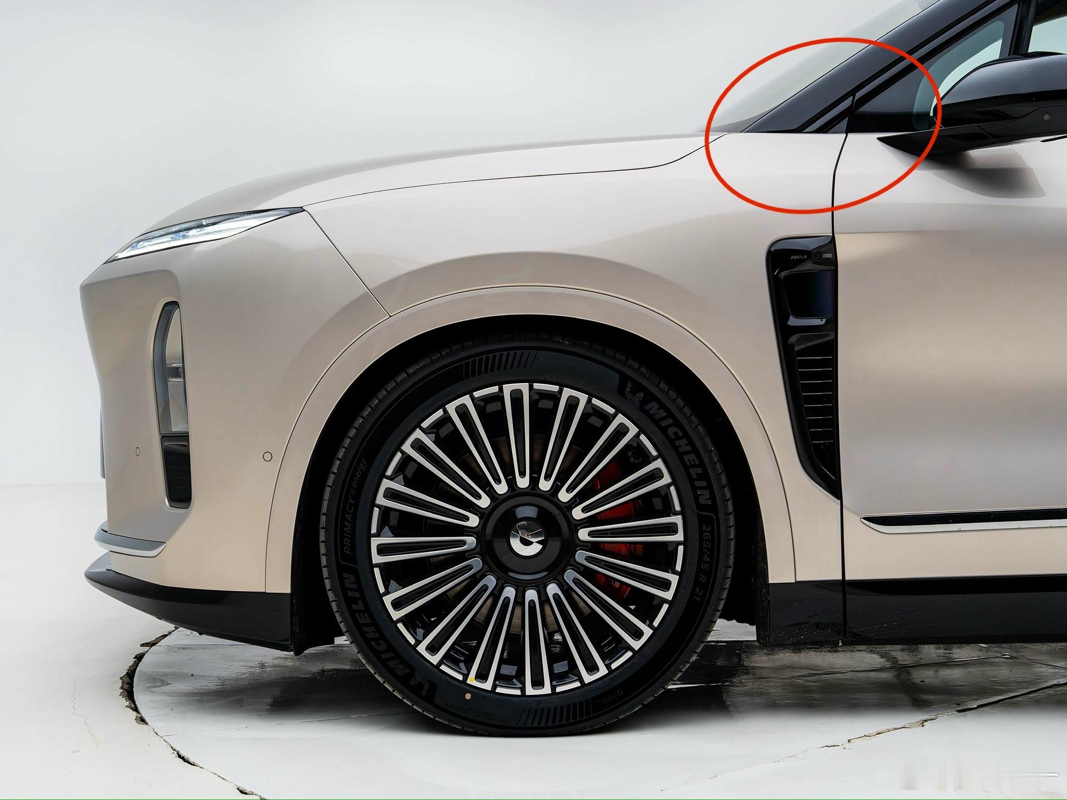 但这块饰板总成夹在前轮与前门缝之间,而新一代蔚来车型又注重“得房率”,车脖子dash to axle不长,有矛盾。所以这块饰板可能会把车门分缝向后推。