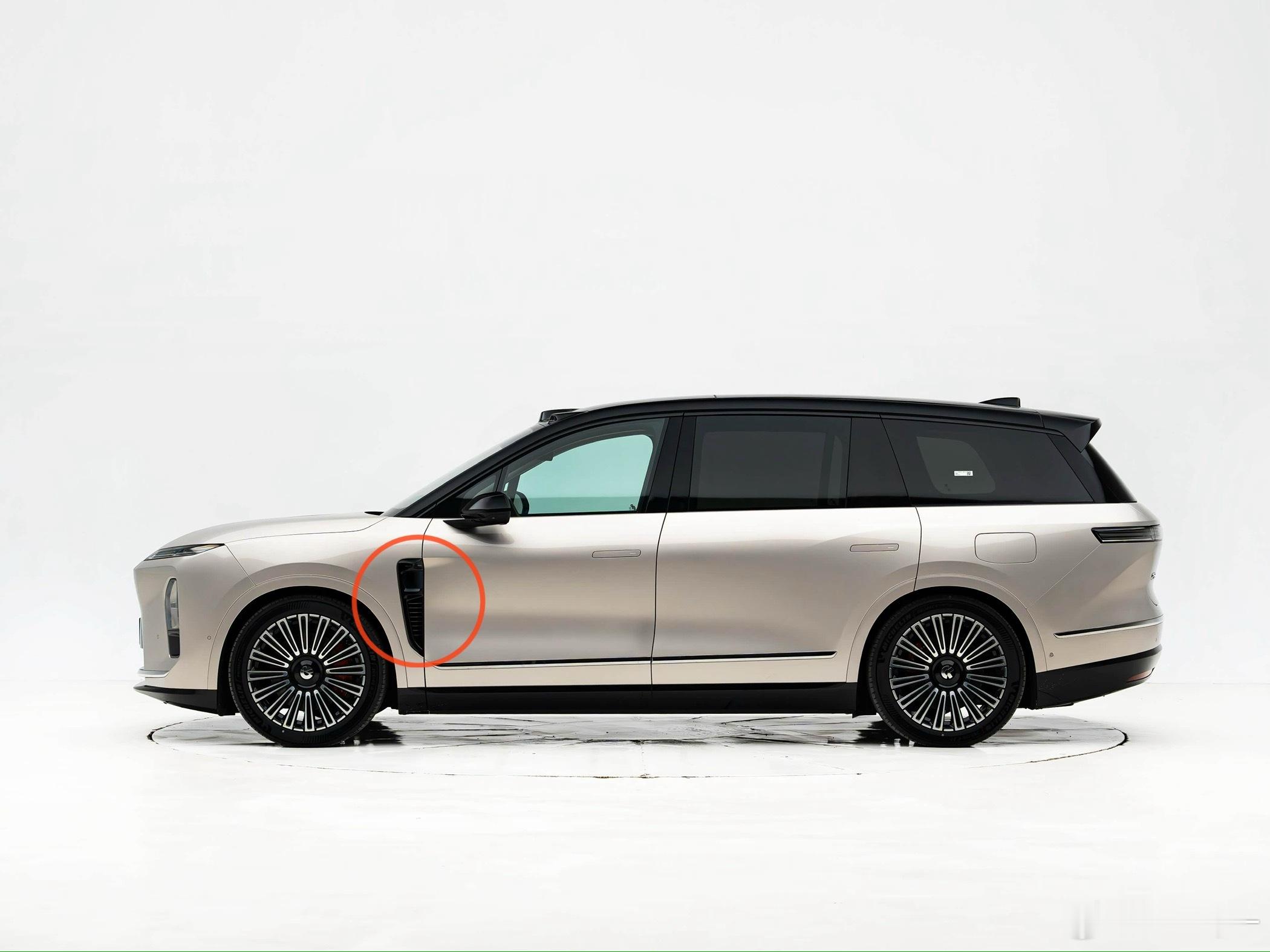 蔚来新一代设计的得与失侧向激光雷达、摄像头、侧导风槽整合在一个亮黑色饰板上,饰板