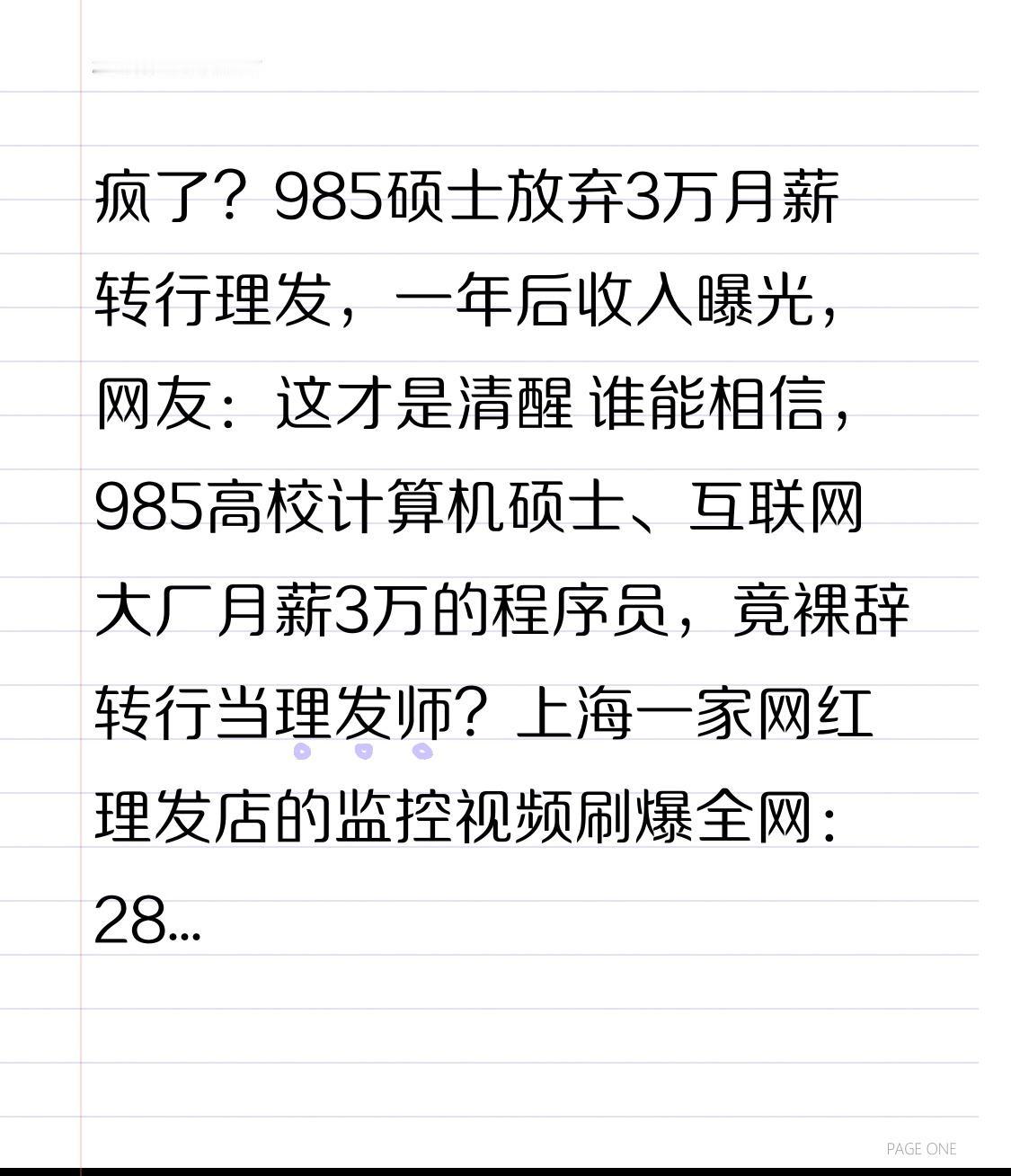 疯了?985硕士放弃3万月薪转行理发,一年后收入曝光,网友:这才是清醒 谁能相信,985高校计算机硕士、互联网大厂月薪3万的程序员,竟裸辞转行当理发师?上海一家网红理发店的监控视频刷爆全网:28岁的小李穿着工装,专注地给顾客修剪头发,手法娴熟利落,可谁能想到,一年前他还是坐在写字楼里写代码的“技术精英”,这波操作让网友炸了锅:“读十几年书难道是为了剪头发?” 小李的选择,一开始就遭到全家反对。父母气得半年不跟他说话,亲戚朋友纷纷质疑“书白读了”,就连前同事都惋惜“放着金饭碗不端,偏要去做没门槛的活”。要知道,他毕业于某985高校计算机专业,校招时拿到多家大厂offer,最终选择的互联网公司,月薪3万+年终奖,是同龄人眼中的“人生赢家”。可没人知道,这份光鲜工作背后,是他每天12小时的高强度加班,是全年无休的焦虑内耗,更是对重复代码工作的彻底厌倦。 而真正的转折点,藏在一次偶然的体验中。小李因长期加班压力大,爱上了理发这项“治愈系爱好”,下班就对着教程练习,还主动给朋友免费剪发。慢慢发现,当顾客因他的手艺变得自信时,那种成就感是写代码从未有过的。更让他坚定决心的是,他发现高端理发行业早已不是“没门槛的活”:顶级理发师需掌握美学设计、头皮护理、色彩搭配等专业知识,美国劳工统计局数据显示,资深理发师年薪可达6万美元,头部从业者收入甚至超过普通白领。这让他意识到,职业没有高低,只有适配与否。 辞职后,小李从零开始:花半年时间在专业美发学校系统学习,考取3个行业高级证书,还去日本进修发型设计。创业初期,他的理发店因“985硕士理发师”的标签引发关注,但也有人质疑“噱头大于实力”。可他用实力说话:结合数据分析能力,精准定位顾客发质需求;用程序员的逻辑思维,设计个性化发型方案;甚至开发小程序方便顾客预约、记录发型偏好。一年后,他的店月营收突破20万,个人收入比当程序员时还高,不少顾客慕名而来,直言“他剪的不是头发,是审美”。 小李的故事,戳中了无数年轻人的痛点。如今Z世代择业早已不再执着于“稳定”和“面子”,超70%的人将“个人兴趣”列为首要因素,“本升技”“学历让位能力”成为新趋势。我们总被“读名校就该做体面工作”的刻板印象束缚,却忘了教育的本质是让人找到热爱的事,而非被学历定义人生。就像小李说的:“剪头发和写代码,本质都是用专业创造价值,只是赛道不同而已。” 你身边有“脱下长衫”做自己的人吗?如果是你,会放弃高薪做热爱的事吗?评论区聊聊你的看法,转发给正在迷茫的朋友,告诉他们:职业没有标准答案,热爱与坚持才是最好的底气!