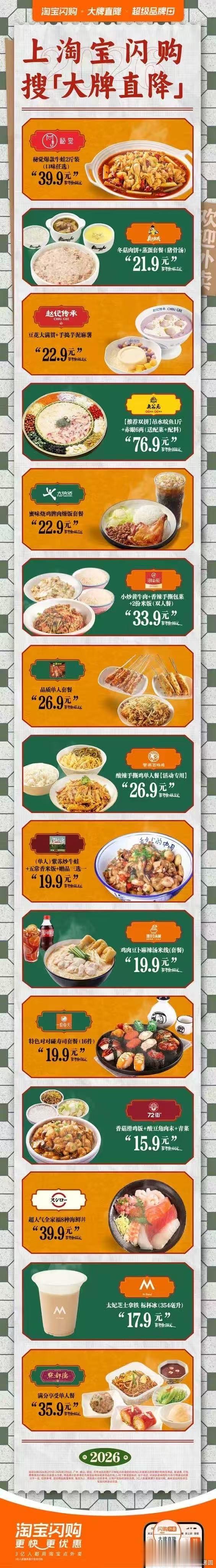 家庭聚餐想食得省事又体面?淘宝闪购19块9大牌随心pick戳这里!淘宝闪购大牌直降帮你搞定一家老小的胃。华莱士堡你满意单人餐15元起,小朋友的最爱;两堡一卷超值餐19.9元起,分量够晒足。长辈们就交点都德满分享受单人餐35.9元起,虾饺皇、红米肠等经典茶点,吃了都点赞。一桌菜满足所有口味,其乐融融。大牌直降,让家庭聚餐变得轻松又周到。2月1日-2月6日,淘宝闪购搜索【大牌直降】,本地美食19.9元起~你家聚餐必点的一道菜是什么?
