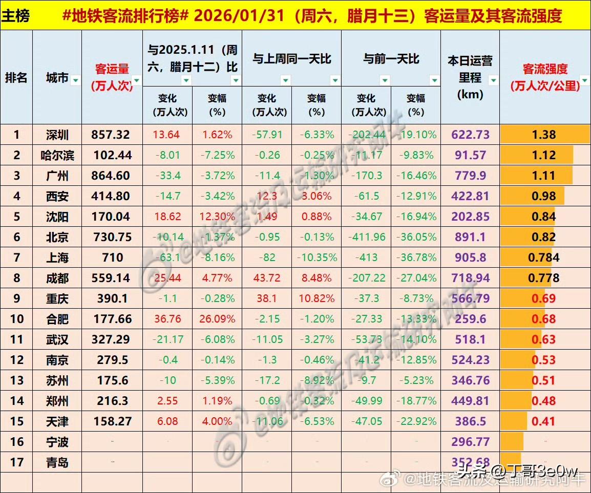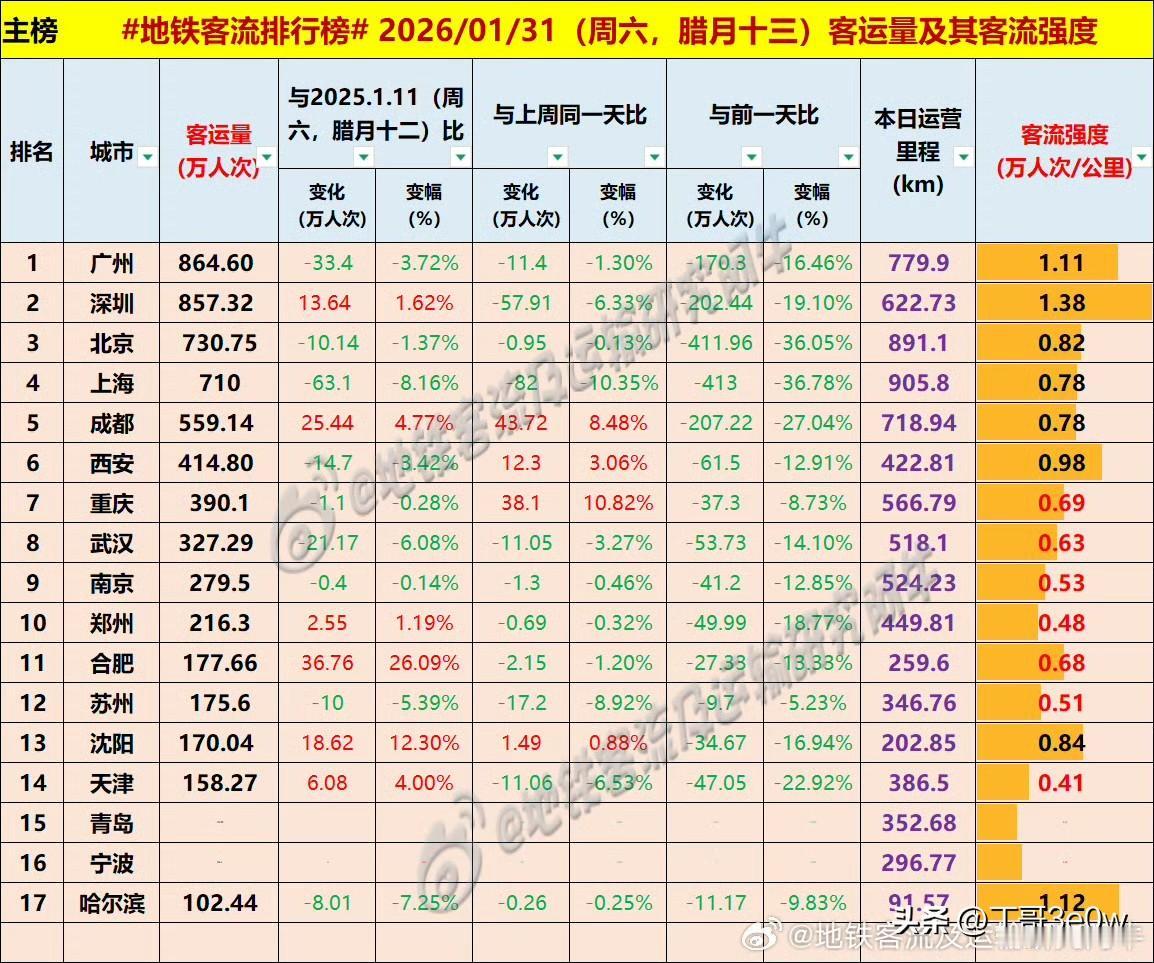 1月最后一天,周六全国仅有17+2个城市地铁客流量超百万人次[呲牙][呲牙][呲牙] 爆料 身边事 中国地铁客流日报 昨日客流 排行榜 周六 2026年1月31日 星期6️⃣ 全国重点城市轨道交通客流量排行榜: 广州:864.60万广州爆料 深圳:857.32万 北京:730.75万北京身边事 上海:710.00万 成都:559.14万 西安:414.80万西安爆料 重庆:390.10万重庆身边事 武汉:327.29万武汉地铁 南京:279.50万南京地铁 郑州:216.30万 合肥:177.66万合肥身边事 苏州:175.60万苏州爆料 沈阳:170.04万沈阳地铁 天津:158.27万天津身边事 青岛:102万+ 宁波:102万+宁波爆料 哈尔滨102.44万