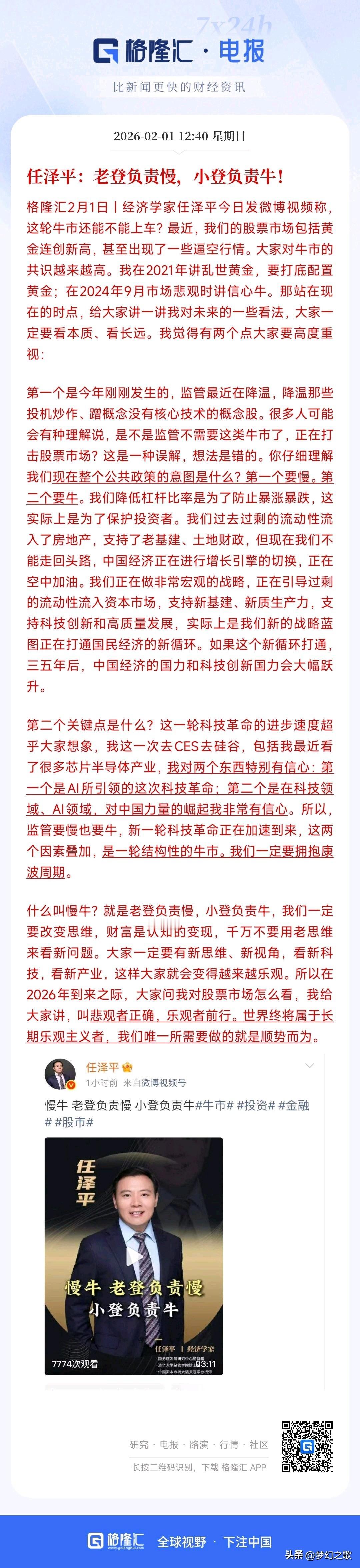 经济学家:现在能不能上车A股的建议 任泽平表示:现在A股和黄金涨势好,牛市共识越来越高,这是结构性牛市,不是普涨,核心看新科技新产业。这轮牛市不应该用炒老基建和老地产的思想出去炒股,应该相信人工智能引领的革命,新科技才是牛市核心的涨点。 事实上,现在的A股真的就是个别板块的牛市,2025年炒的就是科技股,航天军工,别的板块基本上就没有涨,老登股更是跌的惨不忍睹,目前科技股已经调整了一段时间,但是和基本面匹配还远远没有到位,资金也不认可。 目前A股的市场在2026年还不知道炒什么板块,只能等时间的发酵,等待新的概念走出来。