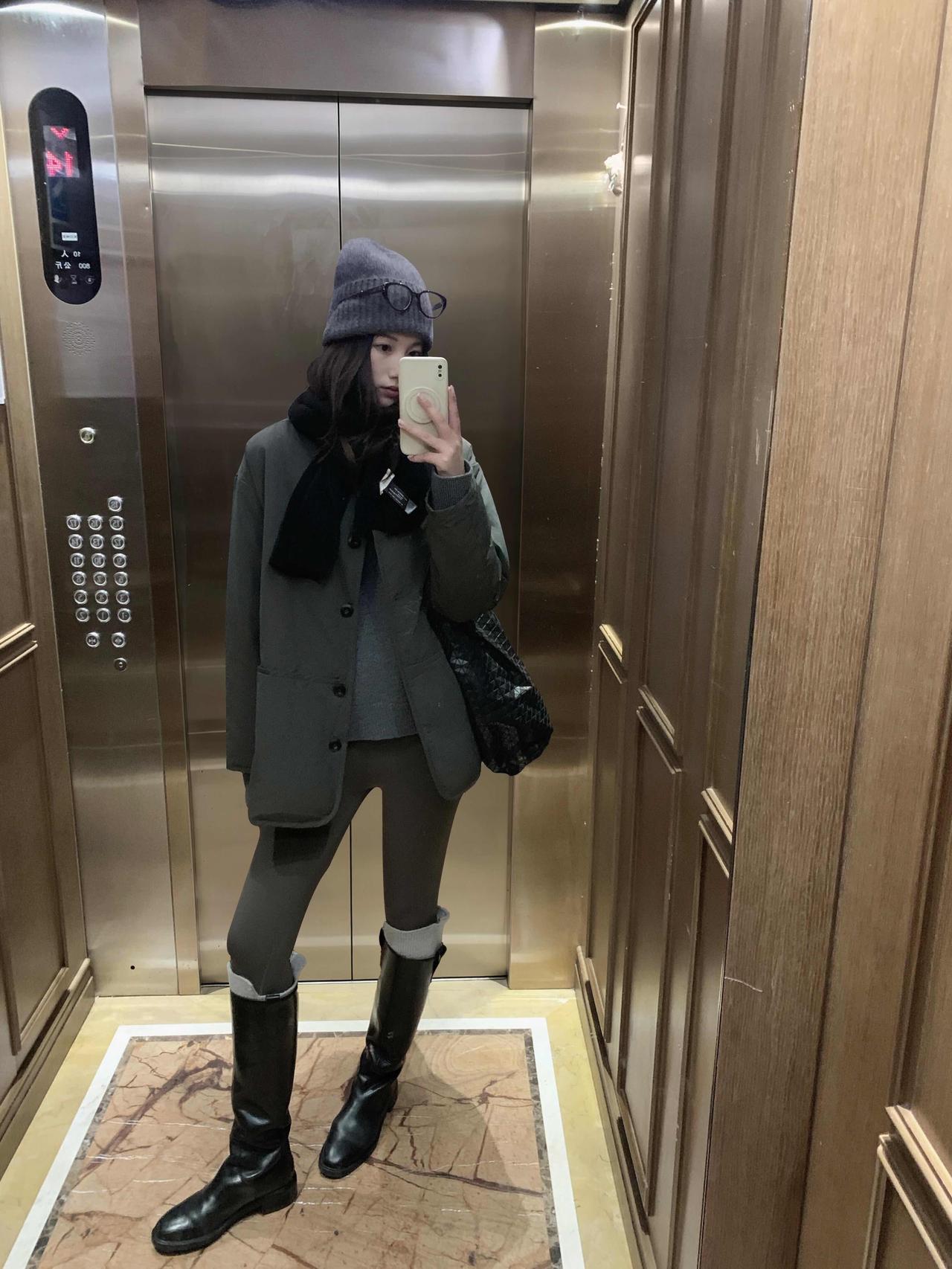 当然是黑色打底毛衣+外套黑色大衣+灰色连体袜 不仅仅时尚还保暖