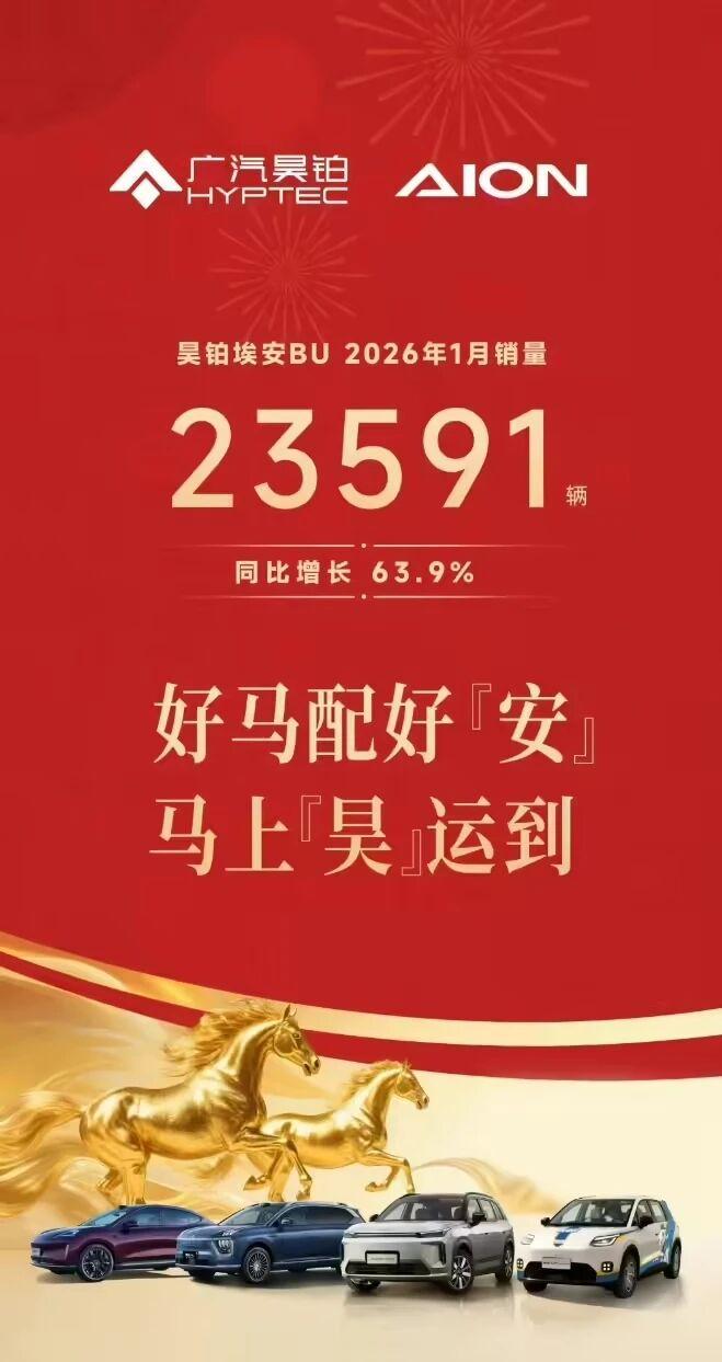 广汽埃安1月销量23591辆,同比增长63.9%。