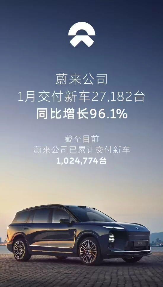 蔚来公司1月交付新车27182辆,同比增长96.1%。