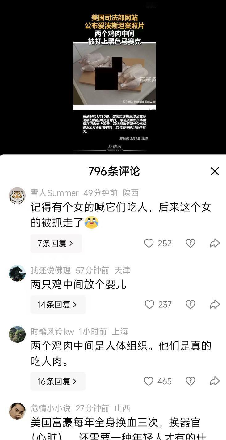 太吓人了! 一开始还以为,是不是网友做的AI假照片,结果发现不是,是真实的美国司法部公布的照片。 虽然中间打了两块黑码,但是仔细看红圈中的部分,看看像什么? 这简直不是人干的事,这就不是人能干出来的事。 这是qs才能干出来的。