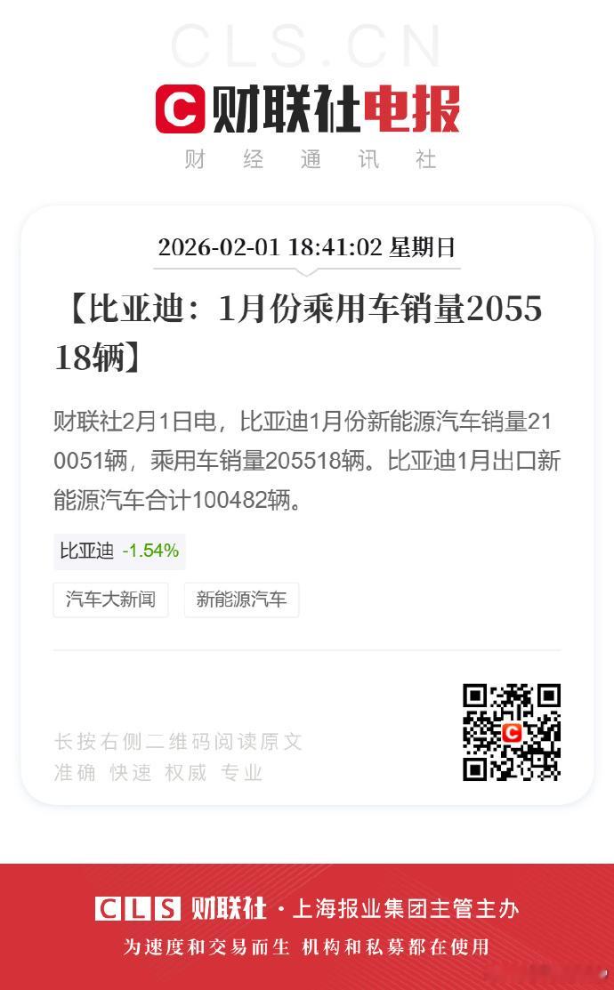 比亚迪1月份乘用车销量205518辆