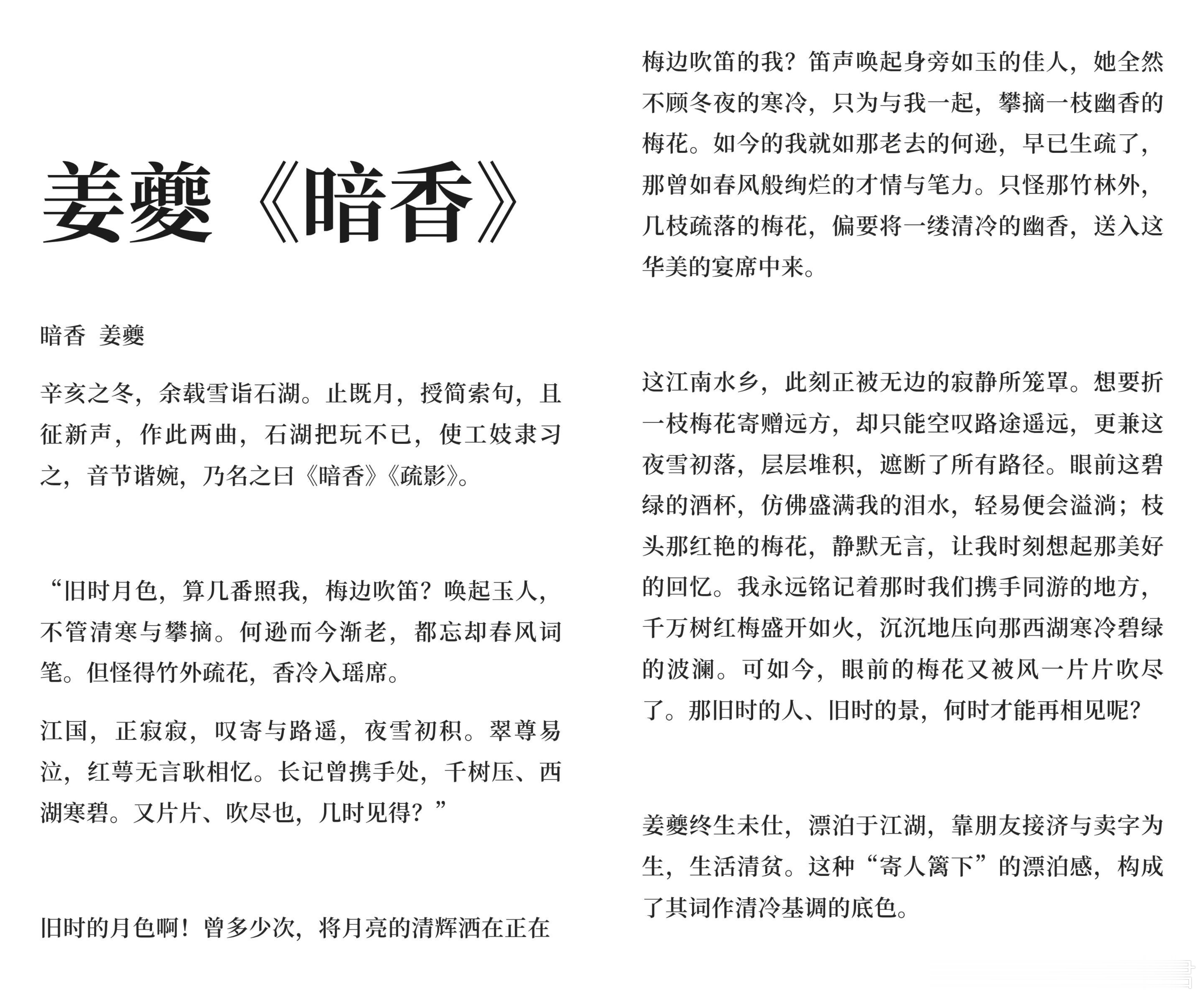 暗香疏影是最成功的梅花宣传文案 真正高级的文案,能为事物注入灵魂。姜夔用《疏影》让梅花承载历史典故,从此它不仅是一朵花,更是一段有厚度的文化记忆。