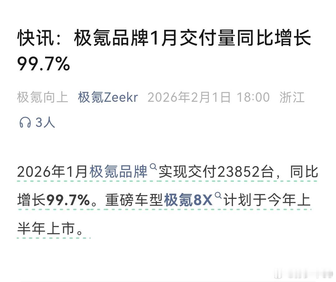 2026年1月极氪品牌实现交付23852台,同比增长99.7%。