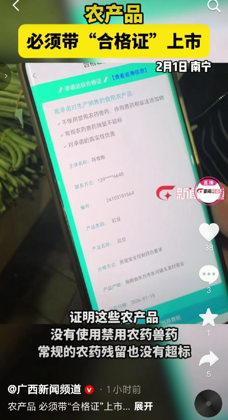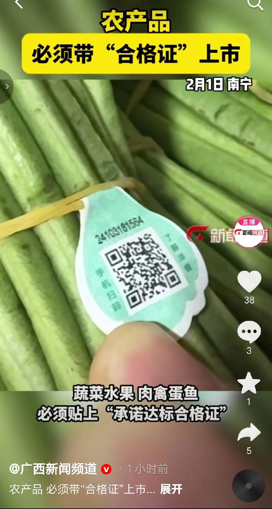 2026年2月1日起施行的《农产品质量安全承诺达标合格证管理办法》要求蔬菜(含人工种植食用菌)、水果、茶鲜叶、畜禽、禽蛋、养殖水产品等七大类农产品,上市销售必须随附承诺达标合格证。生产企业、合作社等需开具合格证且保存不少于6个月;收购商无证不得收购,混装销售需重新开证。此外广西的农批市场等还执行“无证不得进场,快检合格补证后方可入场”的规定。广西通过线上线下多渠道宣传政策;升级“八桂农安”电子开证平台,设指导服务点帮农户便捷开证;推动溯源码和合格证码“两码合一”,消费者扫码能查生产信息、检测报告等;同时严查虚假开具、伪造合格证等违法行为。(来源于@广西新闻频道 )