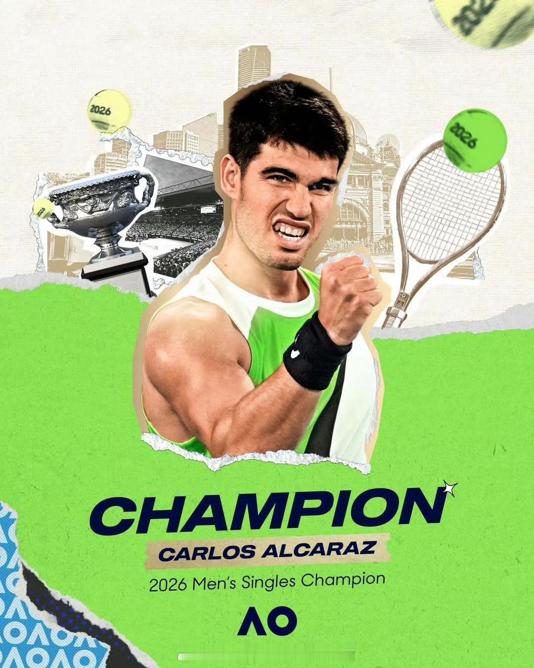 2026年澳网男单决赛,阿尔卡拉斯以2-6/6-2/6-3/7-5逆转德约科维奇,职业生涯首次问鼎澳网桂冠,成就全满贯伟业。