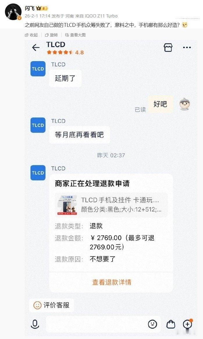 据博主 闪飞 分享,这款 LCD 护眼手机“TLCD”众筹失败,已有买家申请退款。