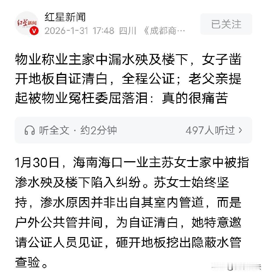 有理说不清?海南海口,物业4年间坚持称女子家管道漏水,殃及了楼下,女子为了证明清白,凿开地板,挖出水管,请公证人员现场见证,施工队表示:水管无渗漏,从入住至今完好。结果一出来,女子的老父亲情绪突然失控,委屈道:这个物业,让我们没办法,真的很痛苦!女子再次找到物业要说法,物业对2021年漏水原因支支吾吾,给不出说法。女子一怒之下告上法院。 2021 年,苏女士家里突然被物业告知,她家出现渗水情况,楼下遭了殃。 苏女士一开始就积极行动起来,她专门请来装修队,对家中地板下的水管做了压力测试。 这一测,结果让她心里有了底,自家地板下水管压根就没有漏水痕迹。 苏女士满心欢喜地以为,这下可以和物业说清楚,还自己一个公道了。 可物业偏偏不认可,非说就是苏女士家的管道漏水,根本不给她辩解的余地。 苏女士觉得这渗水原因,根本不在自家室内管道,而是户外公共管井间出了问题。物业不能只凭一面之词就认定漏水。 其实,苏女士非常焦虑,莫名其妙地被人扣了一顶帽子,任谁都会着急上火,她也着急找到漏水的原因,更想证明自己。 可物业冷漠的态度,可把苏女士气得够呛,心里直犯嘀咕:“这物业咋就这么不讲道理呢?明明测试结果都摆在这儿了,还不相信?” 在生活中,我们常常会遇到这种类似的情况,明明自己有理有据,可对方就是不听不信,那种无奈和憋屈,真是让人有苦说不出。 苏女士这几年就是这样,过的那叫一个憋屈啊,她觉得不能就这么被冤枉下去,一定要把事情查个水落石出。 2026 年 1 月 26 日,苏女士可是做足了准备,她下定决心这次一定要彻底证明自家的清白。 她先是找到了 15 年前为自家装修的施工队,这些老师傅们那可是“身经百战”,对当年装修的情况了如指掌。 接着,苏女士又邀请公证处工作人员到现场全程见证,这样免得没有证人说不清,也能确保公正透明,让物业再也挑不出毛病。 一切准备就绪,苏女士一咬牙,让工人砸开了地板,将地面水泥也刨了出来,室内隐蔽水管,被挖了出来。 这一挖,真相就像被拨开的云雾,渐渐清晰起来。 现场的社区网格员、公证人员和施工单位负责人,都像亲眼见看到苏女士房内的水管不存在破损和渗漏现象。 施工队负责人李先生有着丰富的经验,给出结论:“经过现场检查,可以看到水管上的生产日期,可以证明,苏女士家中的水管没有破损,也无渗漏。 他还表示,这水管还是 15 年前我们装修时用的呢。 另外,再看地板砖表面,毫无色差,这就说明从装修入住到现在,地板一直完好无损。” 听到这些证明,苏女士心里的一块大石头总算落了地,这回总能证明她家水管不漏水了吧。 可这边苏女士刚松了一口气,那边85岁的老父亲却情绪失控,泪眼婆娑。 老人家想起这些年受的委屈,每次有理说不清的窘境,他就万分悲痛,哽咽难言,有苦说不出,他感叹:“这个物业,我们真是毫无办法,我真的很痛苦……” 那声音,仿佛带着无尽的辛酸和无奈,让人听了心里一阵酸楚。 是啊,对于一位老人来说,这么多年被冤枉,却无处诉说,这种痛苦是常人难以想象的。 砸开地板查验后,苏女士再次找到物业方沟通,看看他们这次还有什么话说。 这一回,物业方总算承认苏女士家管道没有漏水了。但对于 2021 年的漏水原因,却支支吾吾,言辞闪烁,不肯给出个明确的说法。 这可把苏女士气得火冒三丈,这么多年了,还不给个说法,遇到问题就推诿扯皮,这不欺负人嘛,她觉得不能再忍气吞声了。 于是,在 1 月 26 日下午,苏女士向法院提起民事诉讼,要求物业道歉、承担全部责任并赔偿相应损失。 其实,生活中楼上漏水,殃及楼下,这种事情确实闹心,苏女士家为了自证清白凿开地板,也是没招儿了,但凡她有别的办法也不会这么做,毕竟,地板被破坏不是钱吗?找工人不花钱吗? 这物业干的事儿,实在让人窝火。苏女士明明有理有据,多次沟通物业却不承认,非得让苏女士大费周章凿地自证。 物业本应是服务业主的,可这儿却成了制造麻烦的源头。 遇到问题,物业不积极调查,就凭主观臆断下结论,这是极不负责的表现。 业主花了钱请物业,是希望得到贴心服务,不是来受气的。而且多年维权无果,让业主身心俱疲,老人都委屈落泪,这物业的良心不会痛吗? 《民法典》第942条规定:物业服务人应当按照约定和物业的使用性质,妥善维修、养护、清洁、绿化和经营管理物业服务区域内的业主共有部分,维护物业服务区域内的基本秩序,采取合理措施保护业主的人身、财产安全。 物业在未充分核实的情况下,自2021年起持续认定苏女士家管道是漏水源头,否定其自行委托的压力测试结果,且始终未对其主张的公共管井漏水可能性进行排查核实,属于未尽到合理的排查、核实义务,存在明显的过错。 苏女士可以主张,包括公证费、砸地板及恢复装修的费用、历次检测水管的相关费用赔偿。 你咋看呢?