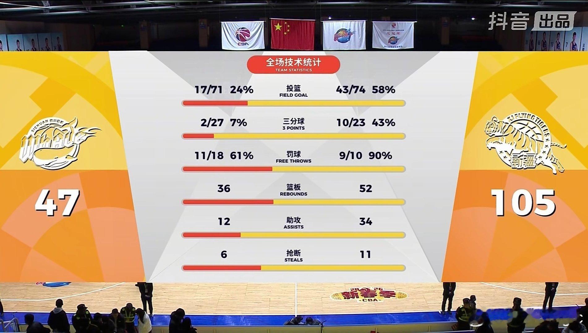 新疆58分大胜四川创cba新赛季最大分差 新疆男篮105-47大胜四川男篮,用“炮哥”分差终结了自己的两连败,同时把四川队的赛季连败纪录扩大到了22场。比赛从一开始就没了悬念,四川队首节状态低迷,前5分钟没拿到运动战得分,单节只得了6分,新疆队则顺风顺水拿到23分,早早确立领先优势 。第二节新疆队火力更猛,单节轰下30分,而四川队不仅三分球16投全失,全队最高得分才4分,半场结束时已经53-18落后35分,比赛悬念提前终结。下半场新疆队稳扎稳打,第三节和第四节继续扩大分差,最终以58分的巨大优势获胜,这也是四川队本赛季的最大输球分差 。球员表现方面,新疆队队长阿不都沙拉木发挥全面,拿到19分、6个篮板和7次助攻,杨芮贡献17分,哈里斯也有15分入账,全队多人得分上双,进攻多点开花。四川队这边,景菡一得到全队最高的14分,李玮颢抢下10个篮板,但整体攻防都和对手差距明显,没能止住连败颓势 。这场比赛也创下了本赛季CBA的最大分差纪录,新疆队通过这场胜利回暖,而四川队则仍在为赛季首胜苦苦挣扎。四川男篮创队史最大输球分差