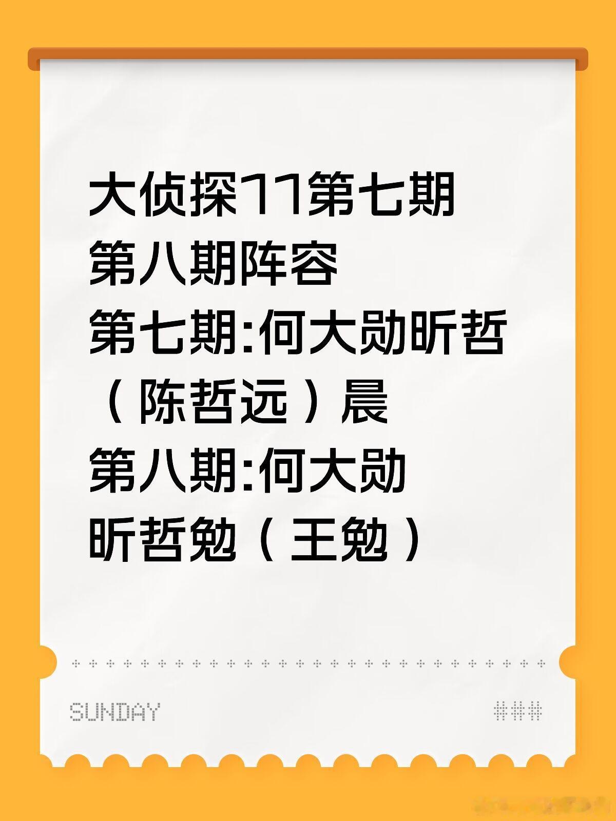 大侦探11第七期第八期阵容第七期:何大勋昕哲(陈哲远)晨第八期:何大勋昕哲勉(王勉)