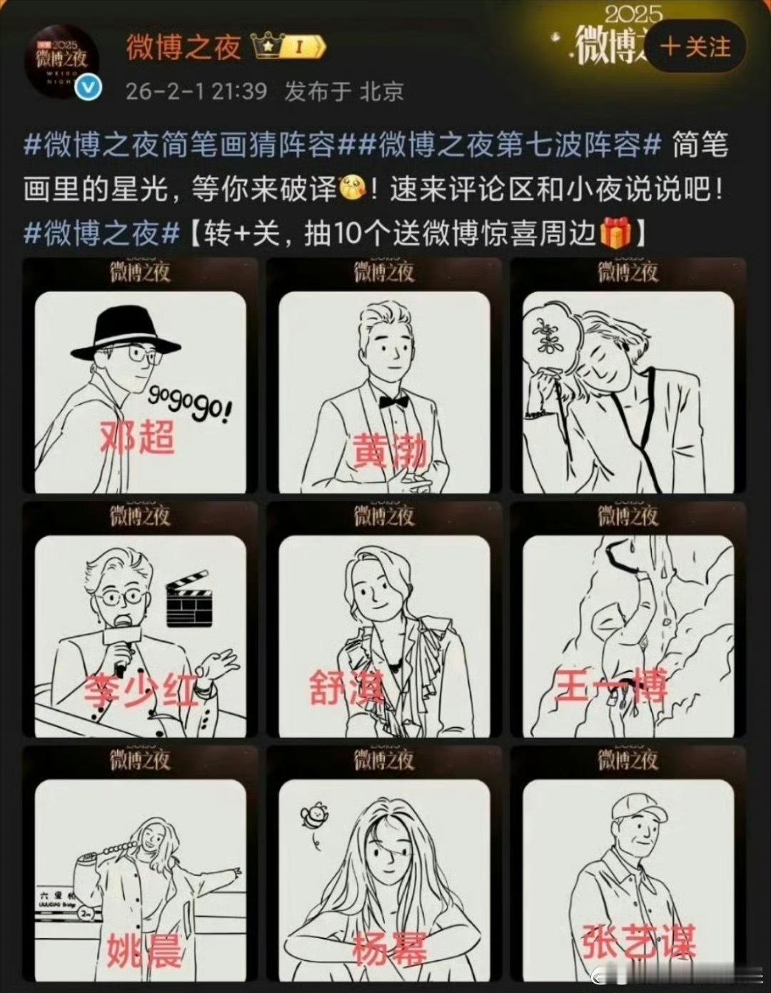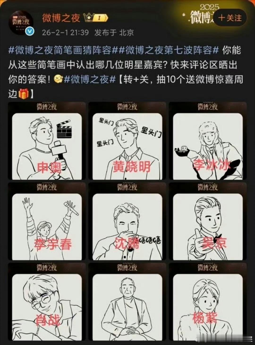 微博之夜第七波简笔画解码第一批:邓超,黄渤,惠英红,李少红,舒淇,王一博,姚晨,杨幂,张艺谋;第二批:申奥,黄晓明,李冰冰,李宇春,沈腾,吴京,肖战,袁和平,杨紫。微博之夜第七波官宣