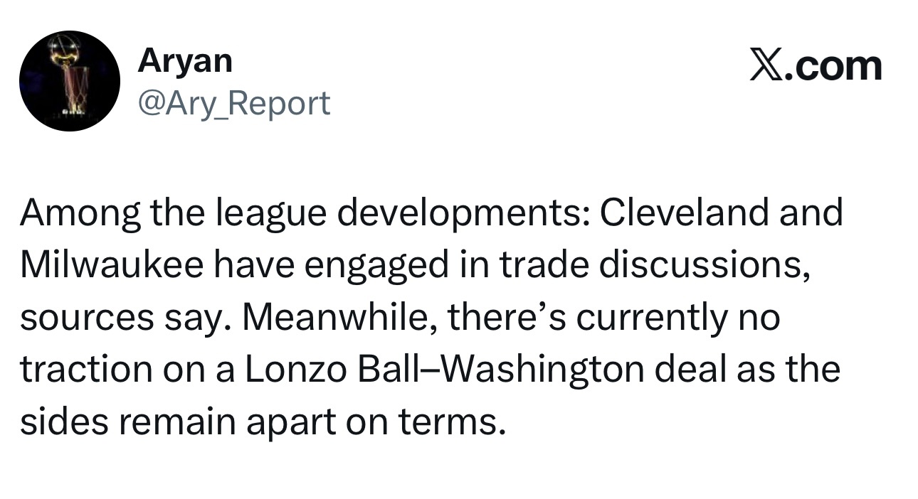 Ary:据消息源透露,克利夫兰骑士队与密尔沃基雄鹿队已经开启了交易谈判。与此同时,朗佐·鲍尔与华盛顿奇才队的交易目前没有进展,双方在合同条款上仍存在分歧。