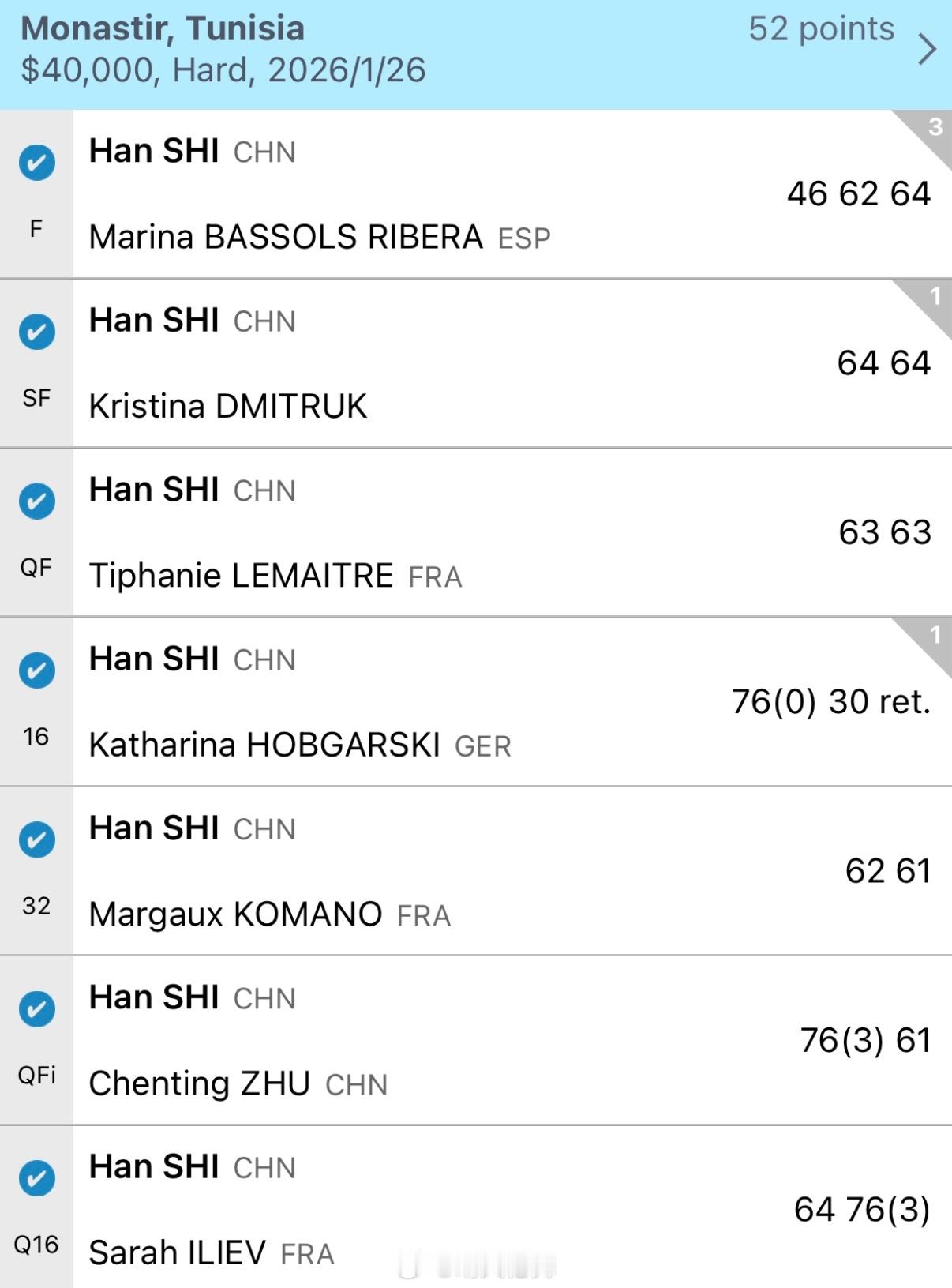 ITF莫纳斯提尔W50决赛施晗🇨🇳以4-6/6-2/6-4逆转四号种子巴索尔斯🇪🇸,本站赛事从资格赛打起连胜七场夺冠,收获52分,即时排名第330位!