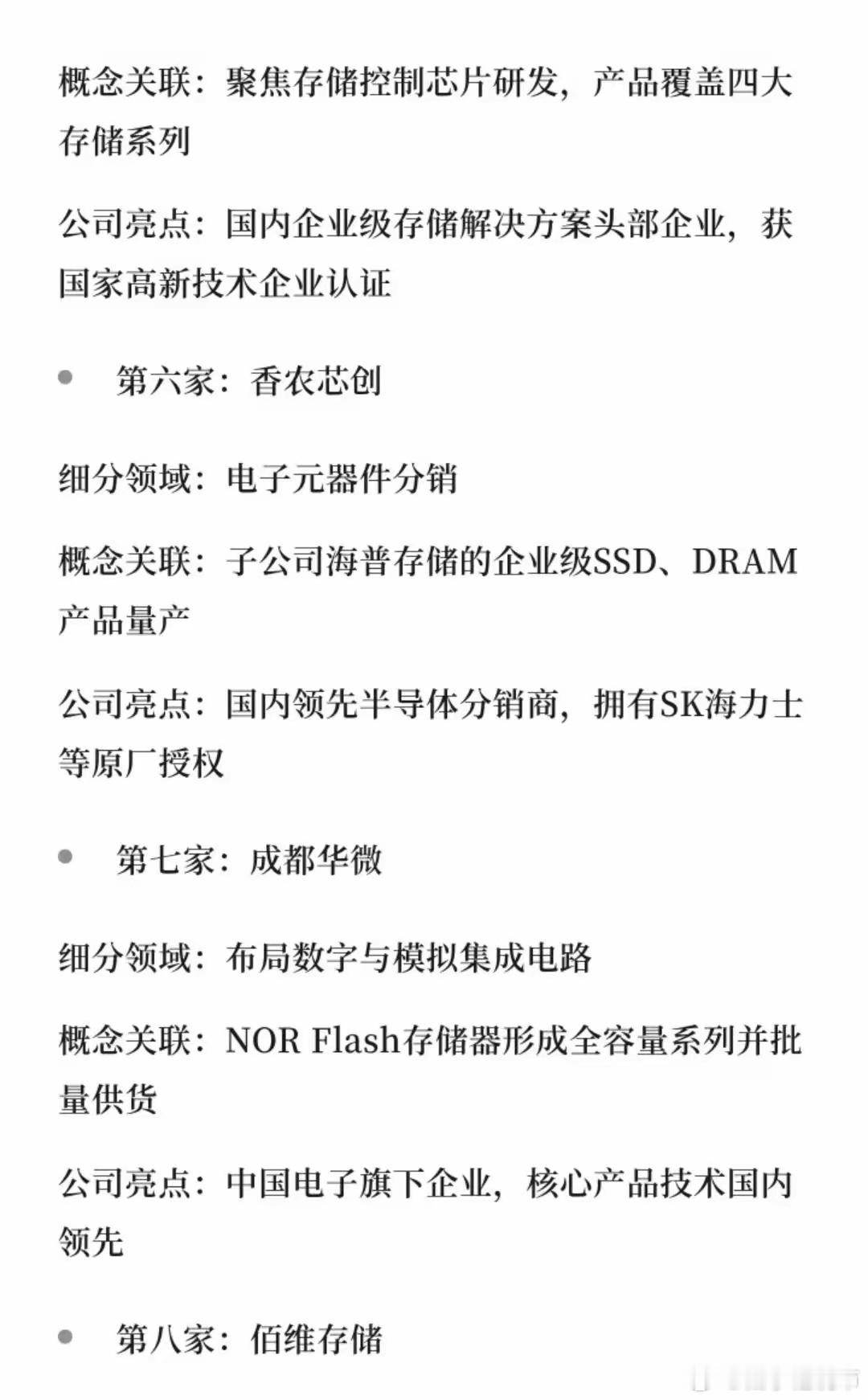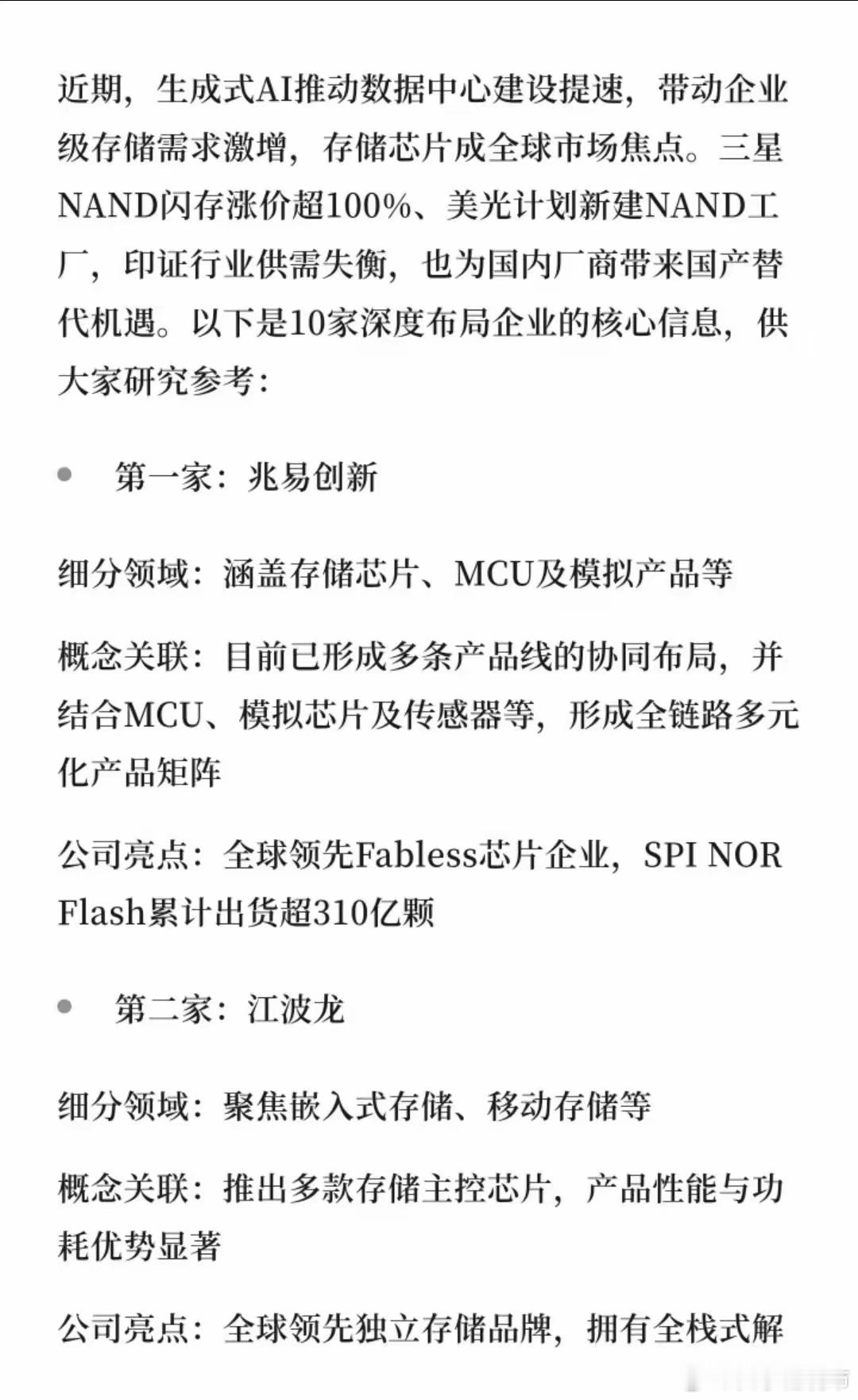 存储芯片强关联的10家公司存储芯片强关联的10家公司近期,生成式AI推动数据中心建设提速,带动企业级存储需求激增,存储芯片成全球市场焦点。三星NAND闪存涨价超100%、美光计划新建NAND工厂,印证行业供需失衡,也为国内厂商带来国产替代机遇。以上是10家深度布局企业的核心信息。