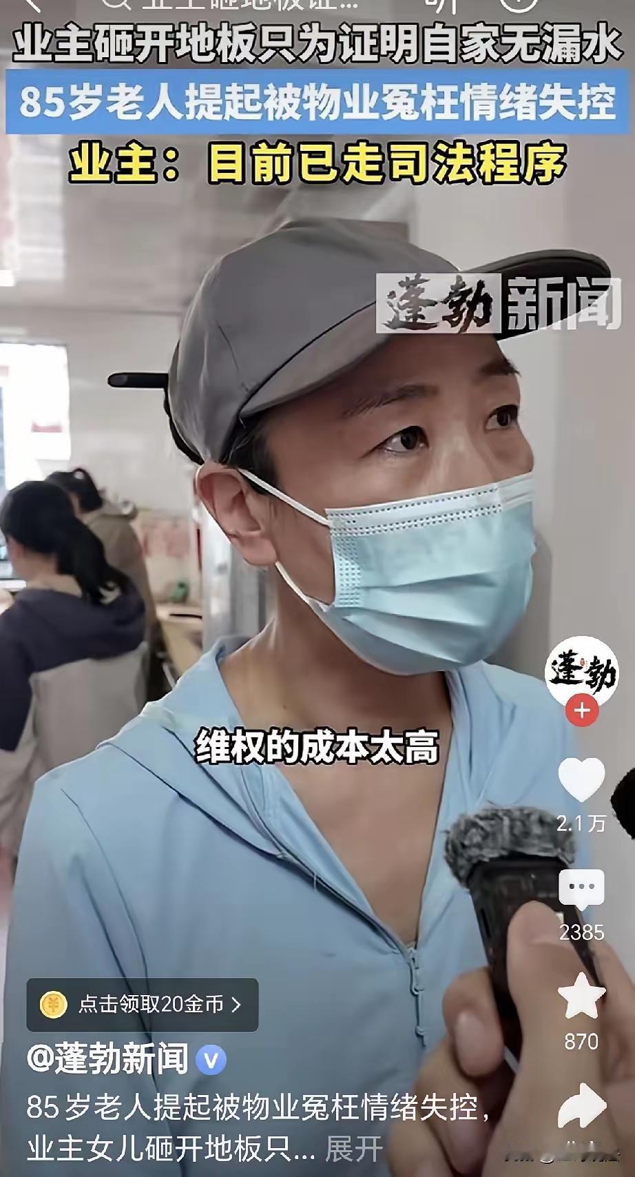 这起事件充分暴露了物业管理中存在的严重问题,也反映出业主在面对不合理指责和处理矛盾时的无奈与委屈。具体分析如下: 一、事件背景与主要矛盾 老人苏先生年事已高(85岁),系曾经的高考状元,背景正直、赖得清白。 楼下业主因漏水停电,物业却一口咬定漏水源在苏家,要求老人赔偿住宿费。 苏先生请装修队进行水管压力测试,证明水管无漏水问题,但物业仍坚持其家有问题。 苏女士耗费财力请来装修队砸开地板,进一步确认水管完好,真相昭示:苏家无漏水。 物业依旧不承认,拒不认错,态度恶劣,甚至言语难听。 二、物业的责任与法律依据 根据《民法典》第942条,物业应妥善维护物业,保障业主权益。 物业未能进行合理调查,错判责任,反而将责任强加于苏家,明显失职。 物业在无法提供证据支持其指控时,应承担责任或至少保持合理的态度。 三、业主的权益受损 苏老人及其女儿遭受精神和身体双重压力,老人情绪激动甚至哭泣。 经济方面,苏女士花费数万元进行检测和拆除措施,付出巨大。 信誉方面,误会和无理指责严重损害苏家的名誉。 四、事件的深层问题 物业管理缺乏责任心和职业素养,未依法履行职责。 缺乏科学、合理的调查流程,仅凭片面指控就贸然认定责任。 业主维权困难,面对强硬物业难以有效抗争,导致权益受到侵害。 五、建议与展望 苏女士已诉诸法律,追求合法权益,彰显依法维权意识。 社会各界应加强物业管理监督,确保物业合法合规履职。 业主和物业应建立良好沟通机制,避免矛盾激化。 此事件也警示广大业主:遇到类似问题时,理性维权、Collect证据、依法行动是关键。 总结: 这是一场典型的物业不作为、业主权益受侵害的案例。正确的做法应当是由物业积极调查、科学检测,并依法承担责任。业主也应通过法律手段维护自身合法权益,避免类似冤枉事件再次发生。希望此事能引起相关单位的重视,推动物业行业形成更加规范、透明的管理环境。物业管理乱象 物业收费乱象
