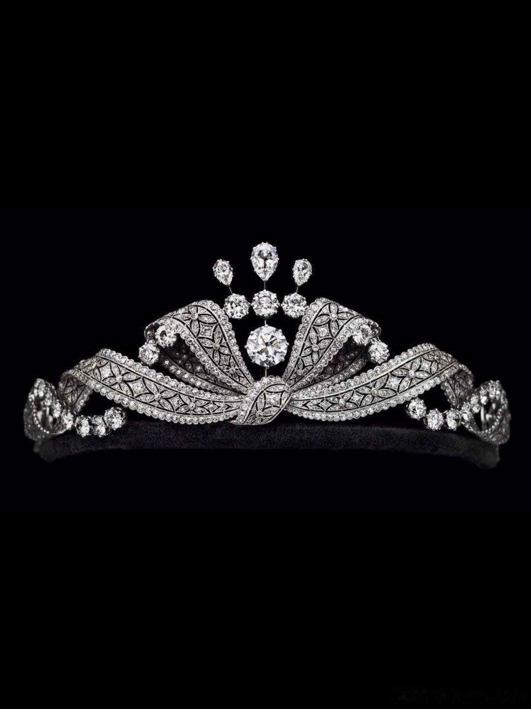 这顶婚礼王冠大约制造于1915年,属于Belle Époque美好时代风格珠宝,以蝴蝶结和簇状羽饰作为设计元素,由于造型好看又特别,这王冠属于某宝仿款里的鼻祖顶流了。