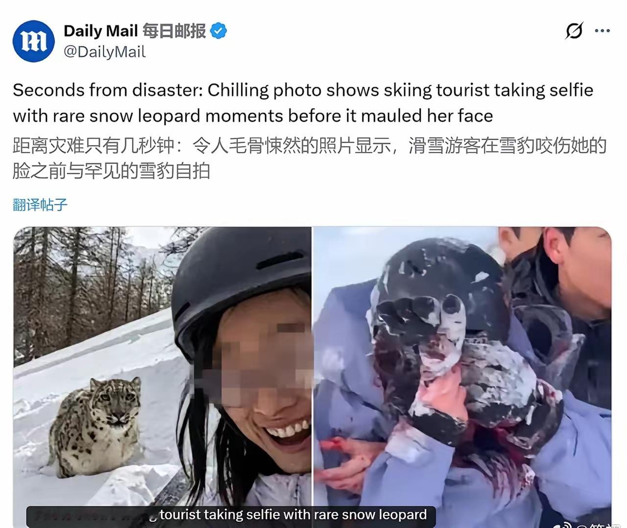 我记得国内平台洗这女的,可不是这么说。说女的就是走在大路上。喜欢雪景所以停留拍摄,被雪豹伤害