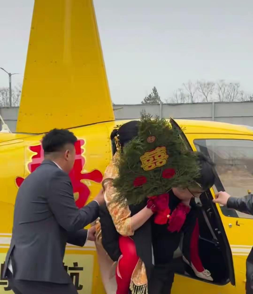 没想到5万块钱,就飞了十几分钟的接亲路! 浪漫是真浪漫,但普通人真没必要跟风凑这热闹。 有人觉得新奇拉风,可这钱花得值吗?背后的日子,终究要自己实打实过啊! 1月29号,太原清徐县的一对新人火了。 他们结婚接亲,没用车队,直接租了架直升机。 机身上贴着大红“囍”字,看着确实亮眼。 新郎说,这是朋友帮忙联系的,提前俩月就预定了。 就想体验下新鲜的,新娘也觉得浪漫。 可你知道吗?这架直升机售价400多万,租金要5到6万。 包含油费、机组人员工资这些,一分都不能少。 十几公里的路程,飞机时速200公里,几分钟就到了。 租赁公司说,这业务刚开,每天不少人咨询。 但飞行前得申请空管,还得找起降场地,规矩不少。 说实话,有钱人家图个新鲜,咱管不着。 可咱普通人,得掂量掂量自己的口袋啊。 5万块钱,可能是有人大半年的工资,是孩子的学费,是家里的应急钱。 婚礼的排场是给别人看的,日子是过给自己的。 打肿脸充胖子,风光就那几分钟。 往后柴米油盐,还是要实打实的钱撑着。 别人不会因为你婚礼办得阔气,就帮你过日子。 自己有多少钱,心里有数,别人也看得明白。 普通人就做好普通人的事,踏实务实比啥都强。 没必要跟着攀比奢华,把日子过红火,才是真本事。 你们觉得接亲该追求排场,还是踏实过日子吗?