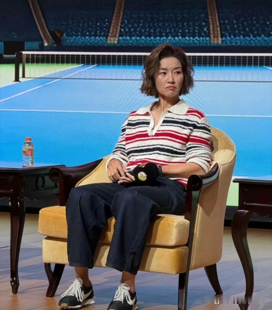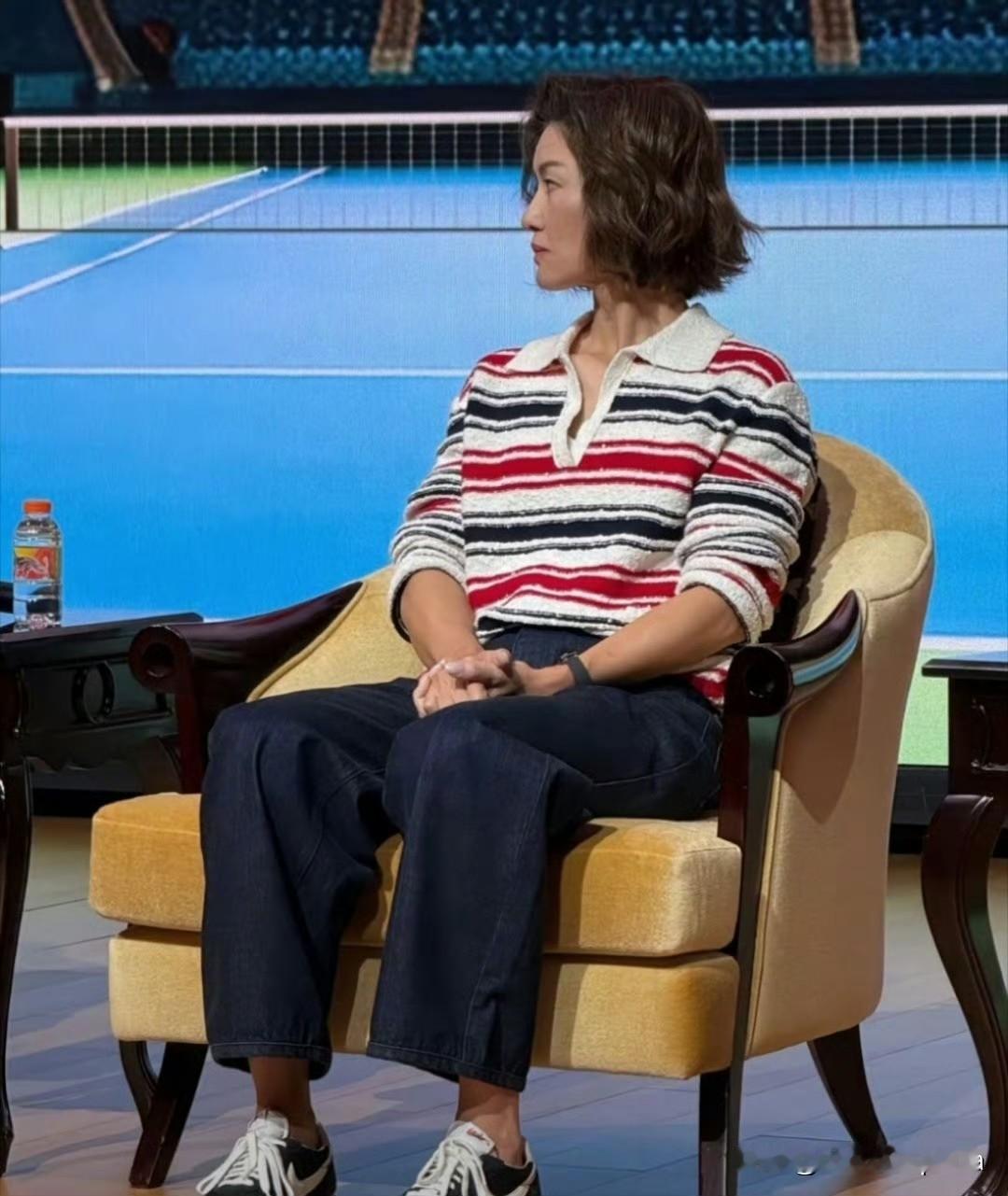 李娜现在虽然不打球了,但整个人的状态还是特别在线的! 这身条纹T恤配牛仔裤、运动鞋的搭配看着真舒服,简单清爽又显气质。 感觉她比打球那会儿是瘦了不少,但身形线条保持得真好,穿这种基础款特别显精神。 整体就是简单大方,态和衣品都不错!
