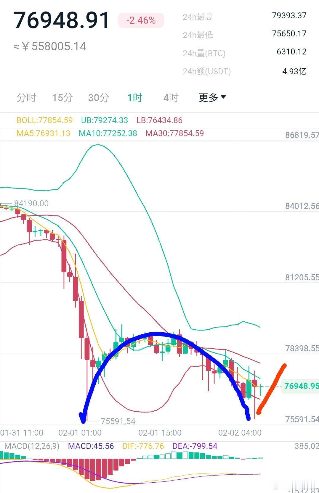 二探双针探底不可追空,如果有在7.6万附近接哆的可继续持有上看7.8万减苍,继续上看8万附近。