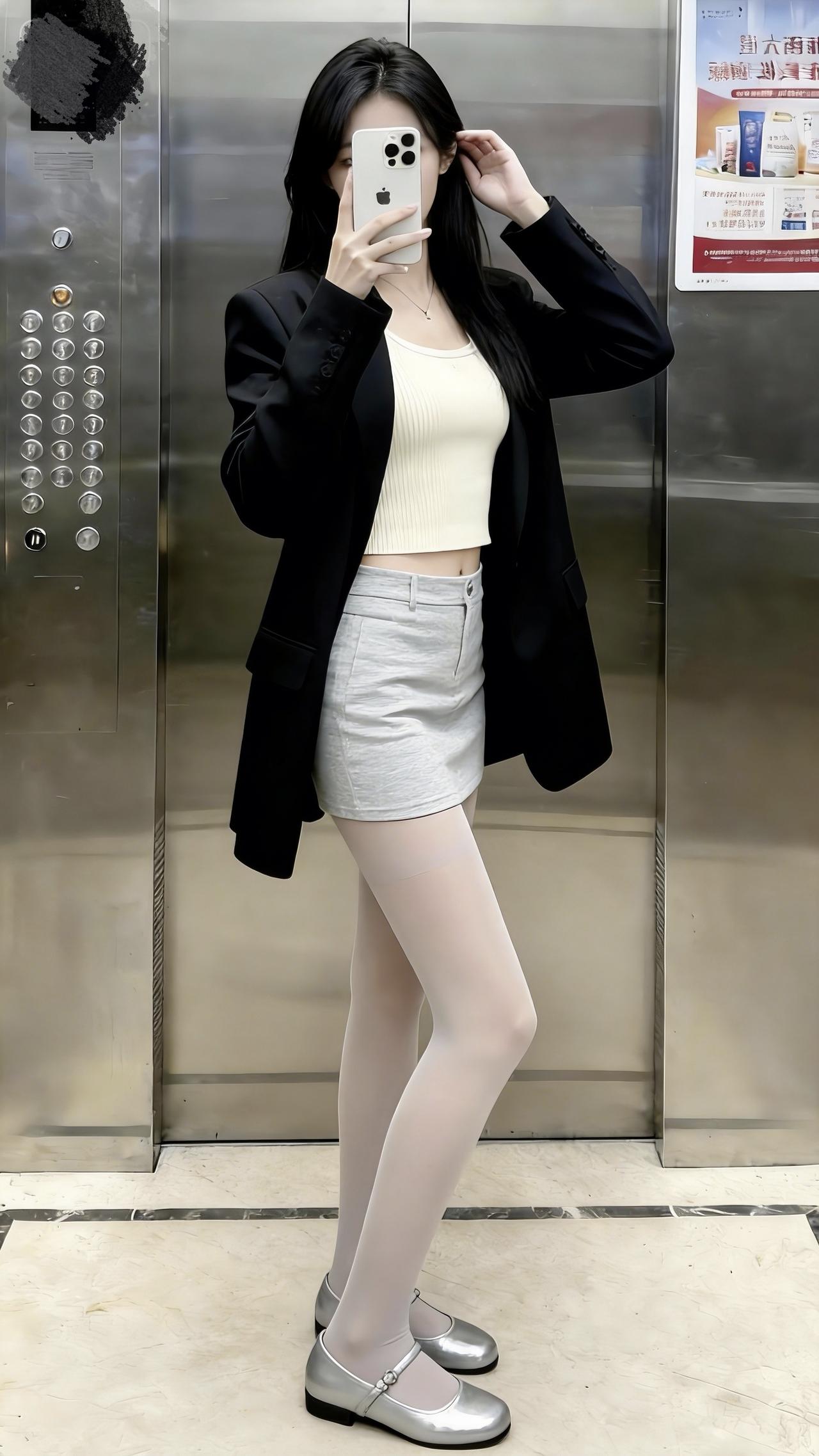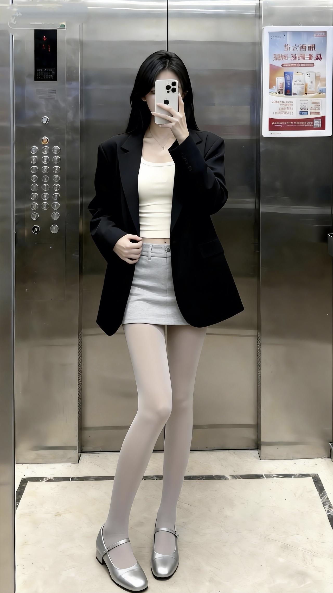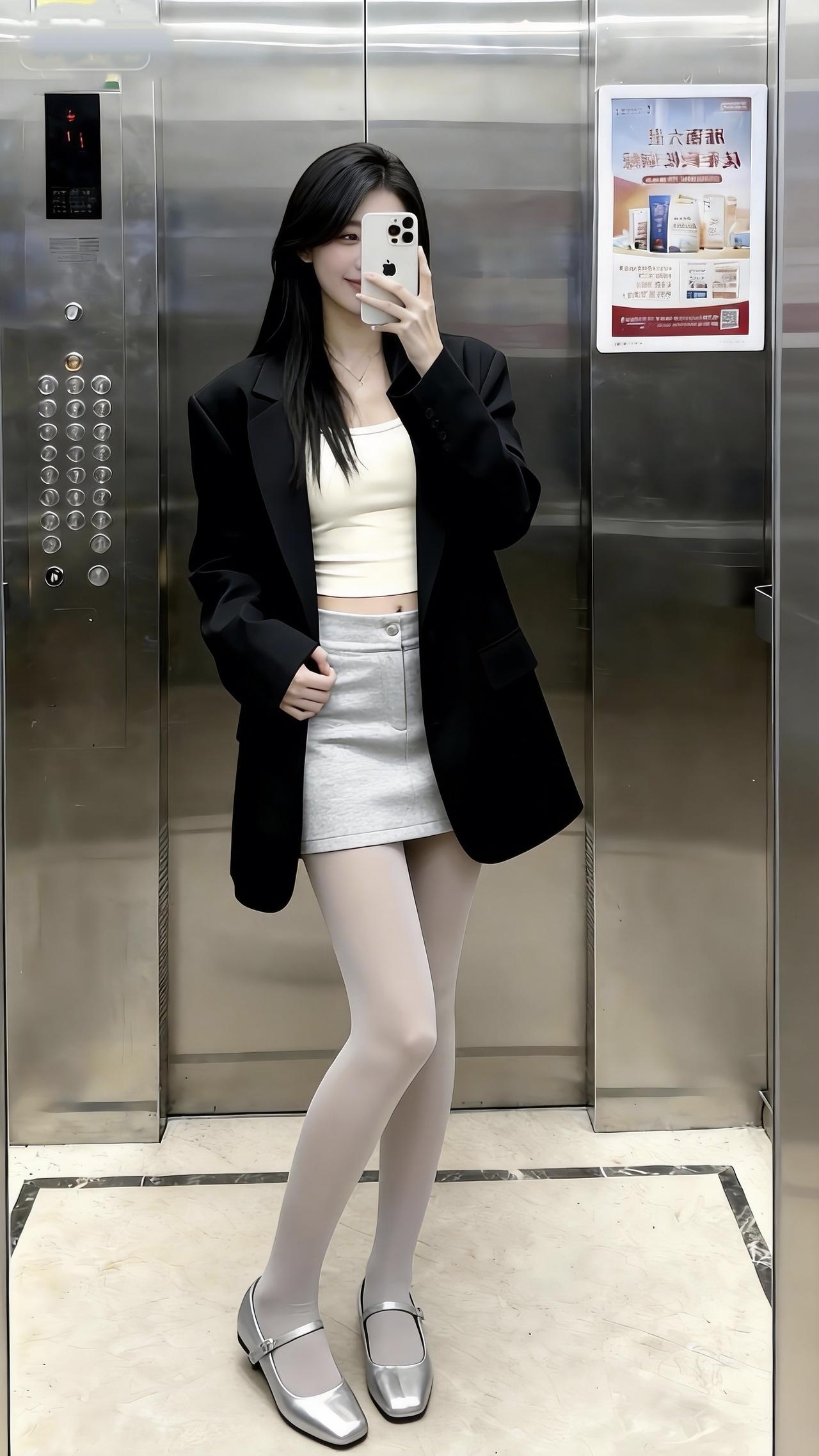 谁还不是个甜妹!在电梯间里,黑西装搭灰短裙,金属玛丽珍鞋的细闪,让松弛感里藏着点精致!又酷又甜!电梯拍照 甜美可爱 甜妹穿搭