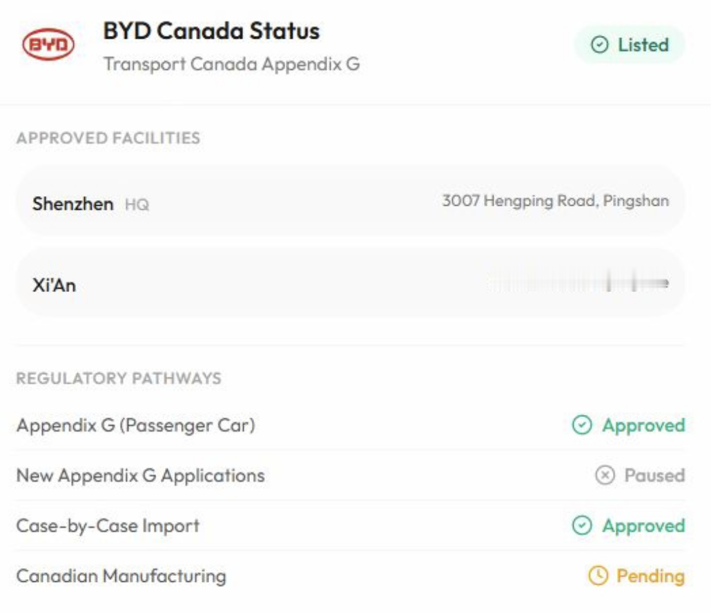 据多家国际媒体及官方通报,加拿大政府近期对中国制造电动汽车(EV)的进口政策作出重大调整——取消此前对中国产电动车征收的100%附加关税,改为年度进口配额制度。今日消息显示,比亚迪或已获得加拿大市场销售准入。汽车知识头条真知汽车季懂车老王 从运输法规信源看,据第三方车辆注册数据库显示,比亚迪汽车已出现在加拿大运输部(Transport Canada)公开的 Appendix G 注册名单中,这意味着比亚迪作为制造商已具备向加拿大市场进口乘用车的基础“入口许可”。换句话说,其部分车型在技术与合规层面已具备销售可能性。尽管如此,比亚迪在加拿大尚未建立大规模经销和售后网络,其市场化操作仍在筹备中。 在公司层面,BYD AUTO CO., LTD.(乘用车)和 BYD Auto Industry Company Limited(商用车)均已获得准入。今年,有望首先引入 Atto 3、Dolphin 和 Seal 三个系列车型,后续甚至可能迎来汉和唐系列进入加拿大市场。比亚迪 对此,中国商务部发言人表示欢迎,并指出配额额度将在一定比例下逐年增加,为中国品牌进一步拓展加拿大市场提供空间。 老王还记得前不久,通用 CEO Mary Barra 曾公开炮轰加拿大取消电动车关税政策,称此举可能动摇北美制造业根基,并直指降低关税门槛会削弱本土车企的竞争力。事实上,在平价电动车领域,通用等传统美国厂商目前尚缺乏足够有力的产品来应对价格压力,这也给中国品牌提供了突出的市场机会。