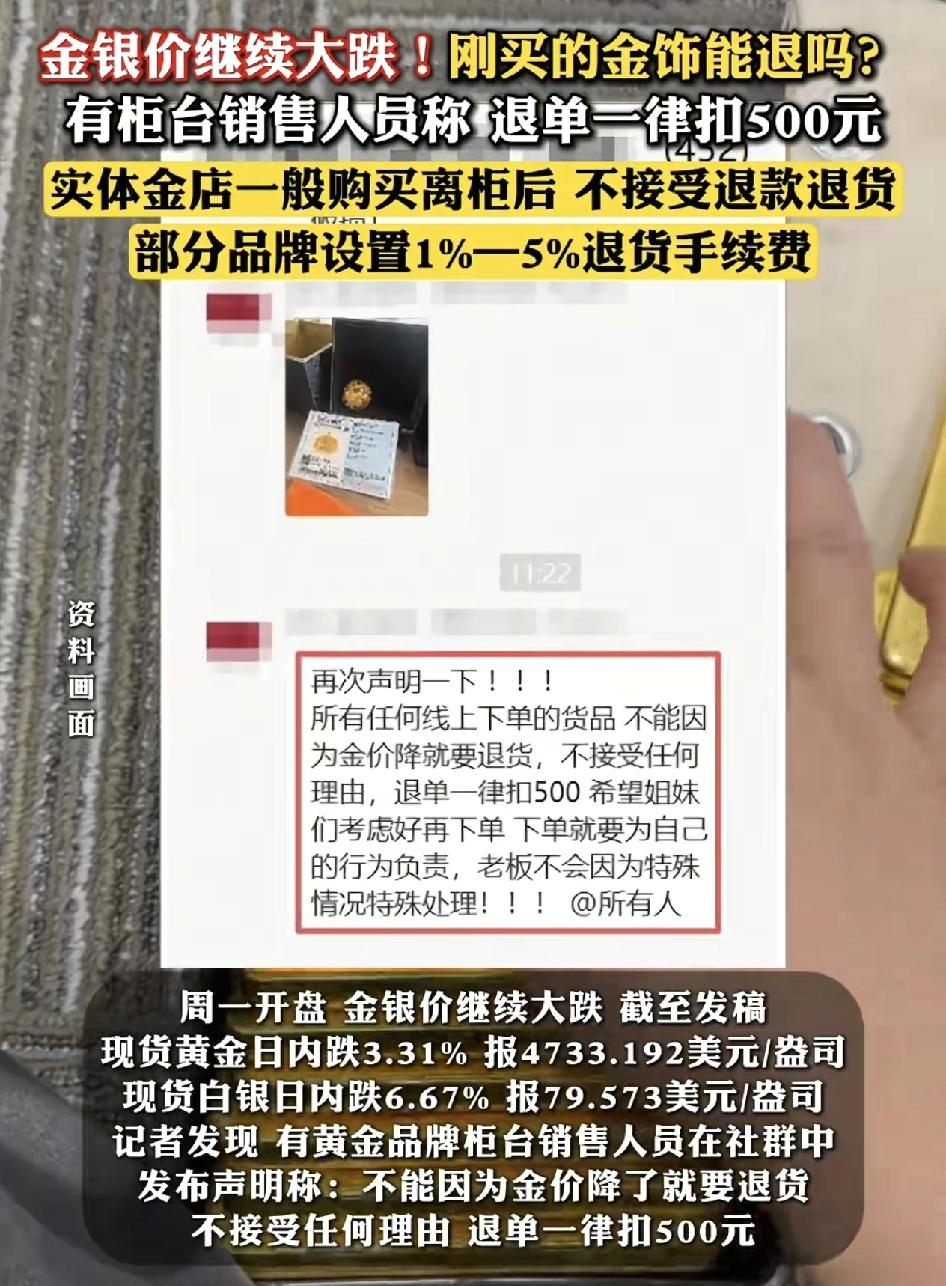 随着金银价格的大跌,少消费者刚入手的金条,有人打算退货,但是很多柜台销售人员表示,卖出去属于投资类产品的金条警示都不接受退货,一旦退货就要一单扣除500块钱,也有的店铺明确表示会扣除1%~5%的手续费,销售人员说,不能因为价格下跌就退货。如果是网上购买的金首饰,也会有限定在24~48小时退货的限制,而且需要不影响二次销售。
