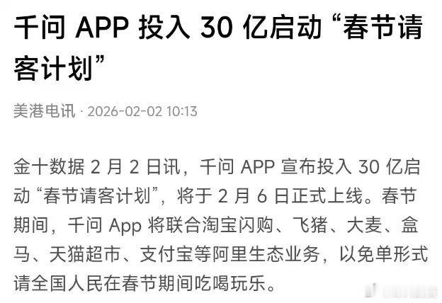 腾讯要在腾讯元宝上发10亿红包,千问要发30亿,2月6日开启。
