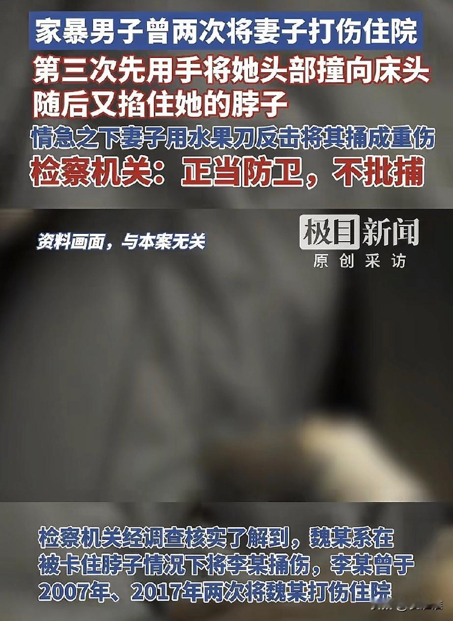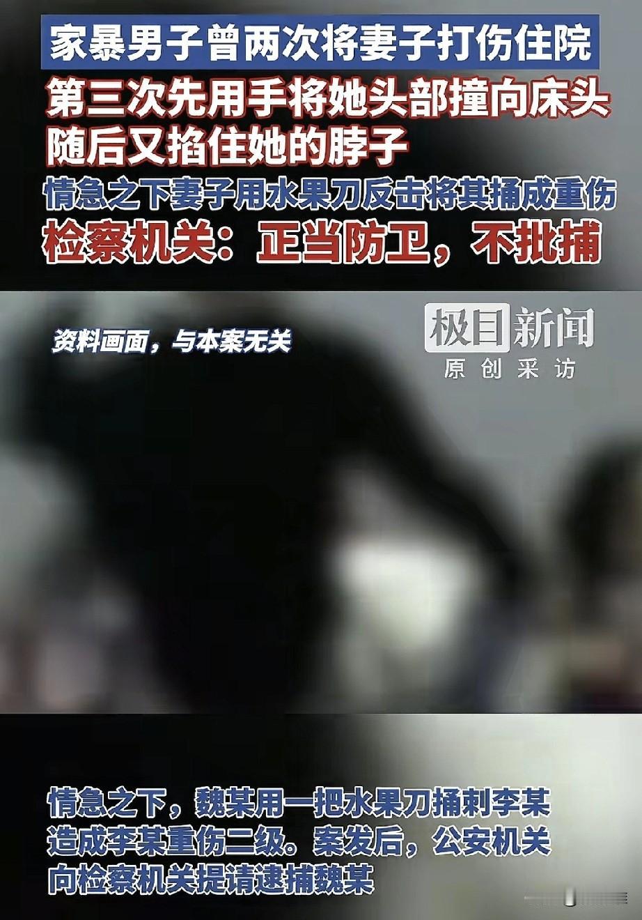 “无需再忍!”湖北一女子长期遭受丈夫家暴,两次被打到住院都选择了原谅。2025年3月,丈夫第三次动手,死死掐住她的脖子,她感到快要窒息,情急之下,她摸到一把水果刀刺向丈夫,致其重伤。 警方以涉嫌故意伤害将她移交检察院批捕,但检察院审查后认为,她是在遭受严重生命威胁时反抗,属于正当防卫,依法不予批捕。 这次给法官点赞,判的好!